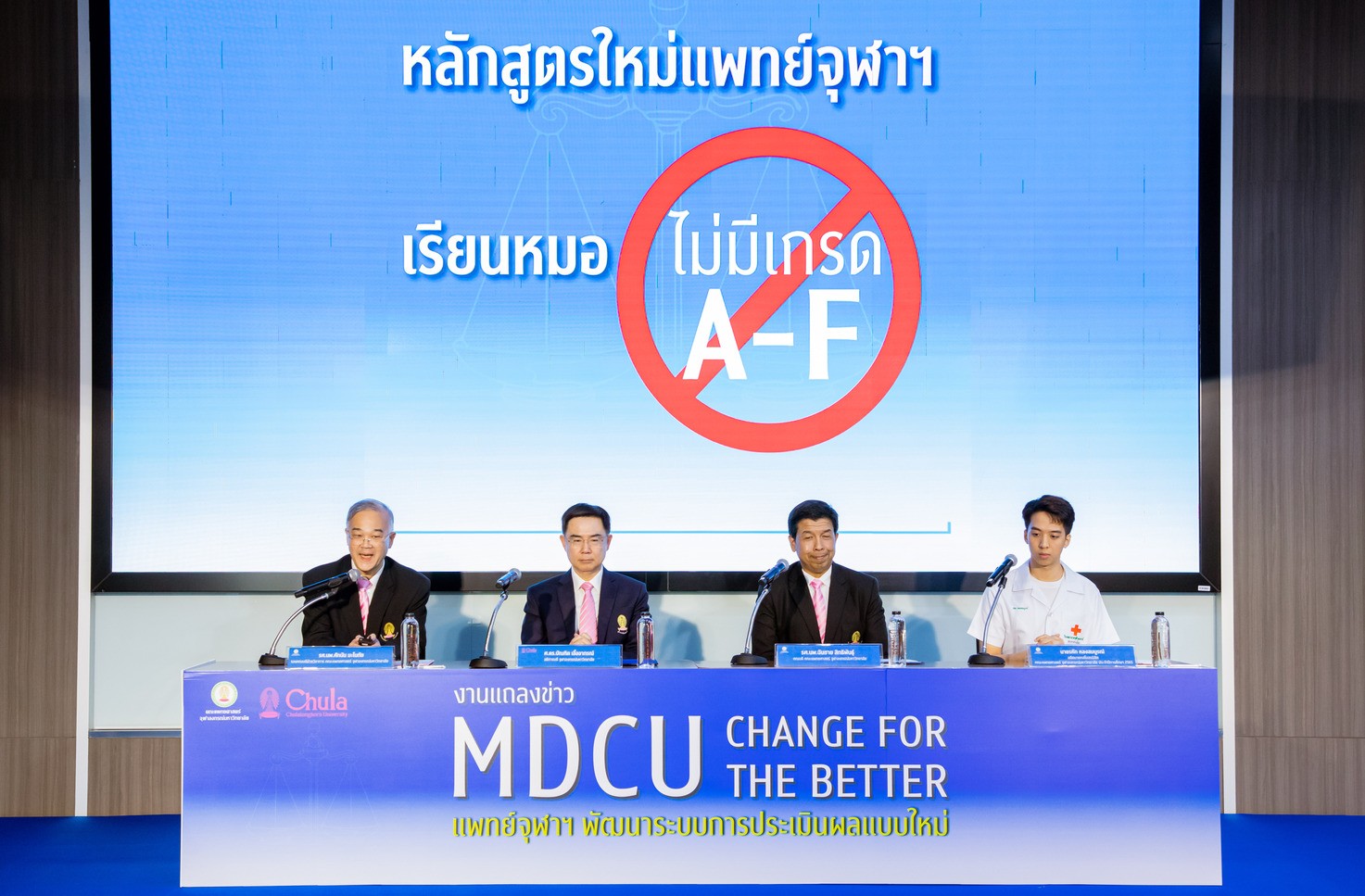 ศ.ดร.บัณฑิต เอื้ออาภรณ์ อธิการบดี จุฬาลงกรณ์มหาวิทยาลัย พร้อมด้วย รศ.นพ.ฉันชาย สิทธิพันธุ์ คณบดี คณะแพทยศาสตร์ จุฬาฯ รศ.นพ.ศักนัน มะโนทัย รองคณบดีฝ่ายวิชาการ คณะแพทยศาสตร์ จุฬาฯ และ นสพ.รหัท หลงสมบูรณ์ นายกสโมสรนิสิตคณะแพทยศาสตร์ จุฬาฯ ปีการศึกษา 2565 ได้ร่วมกันแถลงข่าวเปิดตัว MDCU Change for the Better “หลักสูตรแพทยศาสตรบัณฑิต (หลักสูตรปรับปรุง พ.ศ. 2567)” หลักสูตรฉบับภาษาไทยสำหรับนิสิตที่จะเข้าศึกษาตั้งแต่ปีการศึกษา 2567 เป็นต้นไป โดยในหลักสูตรนี้มีการปรับปรุงพัฒนาในหลายด้าน และการเปลี่ยนแปลงที่สำคัญยิ่ง คือ การปรับเปลี่ยนการแสดงผลการประเมินนิสิตในแต่ละรายวิชาเป็น S/U (Satisfactory/Unsatisfactory) ตลอดหลักสูตร แทนการแสดงผลการประเมินแบบดั้งเดิมที่เป็นสัญลักษณ์ A-F