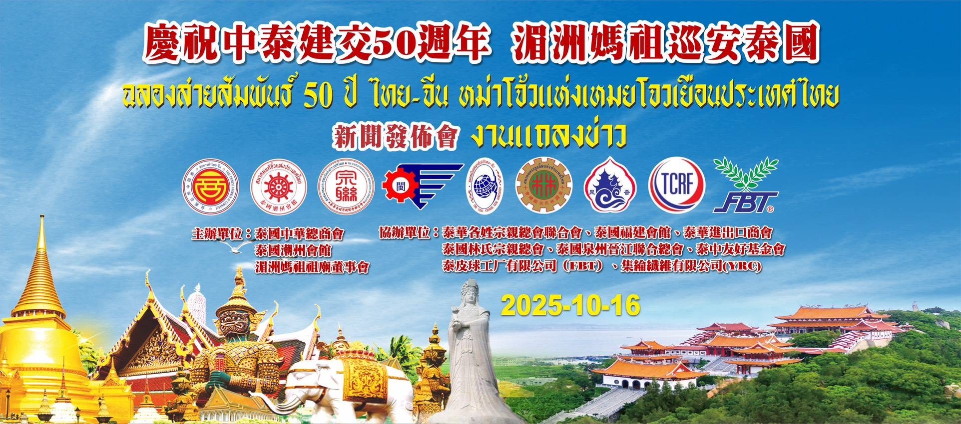 เมื่อวันที่ 16 ตุลาคม 2568 หอการค้าไทย-จีน และสมาคมแต้จิ๋วแห่งประเทศไทย จัดงานแถลงข่าวการจัดงาน “ฉลองสายสัมพันธ์ 50 ปี ไทย-จีน : หม่าโจ้วแห่งเหมยโจวเยือนประเทศไทย” ณ ห้องประชุม สมาคมแต้จิ๋วแห่งประเทศไทย