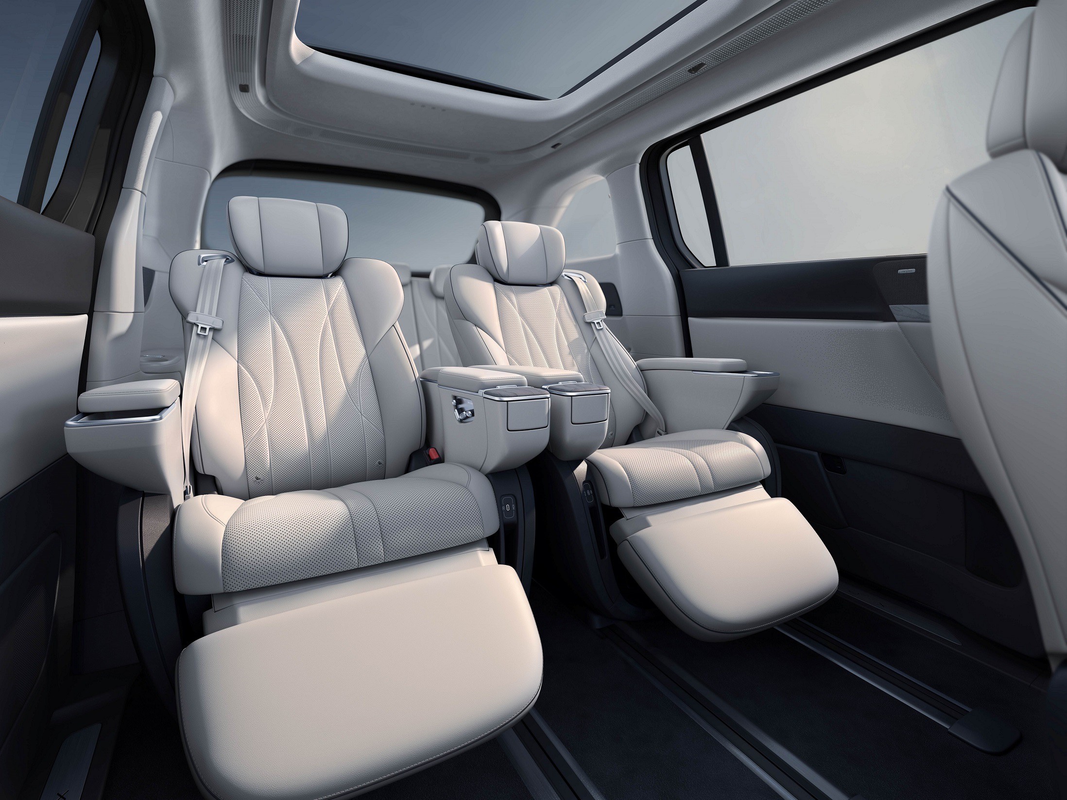 รถตู้ไฟฟ้าทรงสปอร์ตอัจฉริยะรุ่นท็อป ที่มาพร้อมความพิเศษยิ่งขึ้น โดดเด่นด้วยสีภายนอก Matte Gray ครั้งแรกในตลาด MPV ไฟฟ้าสอดรับกับเฉดสีภายในใหม่ Light Gray เบาะหนังแท้แนปป้า (Nappa) ผสานฟังก์ชั่น Zero-gravity Seat หรูหรามีระดับ เบาะนั่งแถวสองปรับไฟฟ้า 18 ทิศทาง พร้อมที่ชาร์จแบบไร้สาย 50 วัตต์ ล้ออัลลอยใหม่ดีไซน์แบบ Starlight Floating Wheels ขนาด 20 นิ้วผสานการขับเคลื่อนด้วยเทคโนโลยีแบตเตอรี่ 800 โวลต์ รองรับความเร็วในการชาร์จสูงสุดถึง 317 กิโลวัตต์ แบตเตอรี่ NCM ขนาด 101.5 กิโลวัตต์ ชาร์จไฟเต็มขับได้ไกลสุด 690 กิโลเมตร (NEDC) อีกทั้งยังมาพร้อมระบบเลี้ยว 4 ล้อ ให้รัศมีวงเลี้ยวเพียง 5.4 เมตร