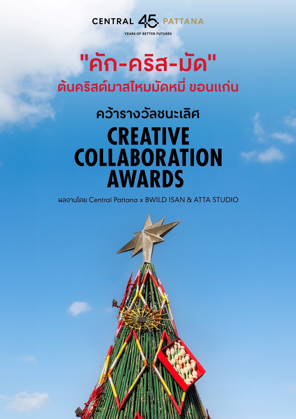 Dr. Kantaphon Phanitrat, Head of Marketing (Asset Group 2-5) at Central Pattana Plc., said: Central Pattana is truly proud that ‘Kak-Christ-Mud’, also known as ‘The Silk Mudmee Christmas Tree’, has won the Creative Collaboration Award. This project reflects the power of collaboration across all sectors — from the private sector, represented by Central Pattana as a Place for All developer, who transforms shopping centres into destinations that connect cities, communities, and local artists, to our creative partners at BWILD ISAN, ATTA STUDIO, and the Tourism Authority of Thailand (TAT), as well as local craftsmen and communities in Khon Kaen. Together, we have showcased the unique identity of Khon Kaen — the ‘World Mudmee City’ — to a global audience. ‘Kak-Christ-Mud’ is more than just an artistic city installation; it stands as a symbol of how festive occasions can become a platform for collaboration and sustainability. It embodies shared value creation — economically, socially, and environmentally — through thoughtful Circular Design, the use of locally sourced and reusable materials, and by returning income to local communities.