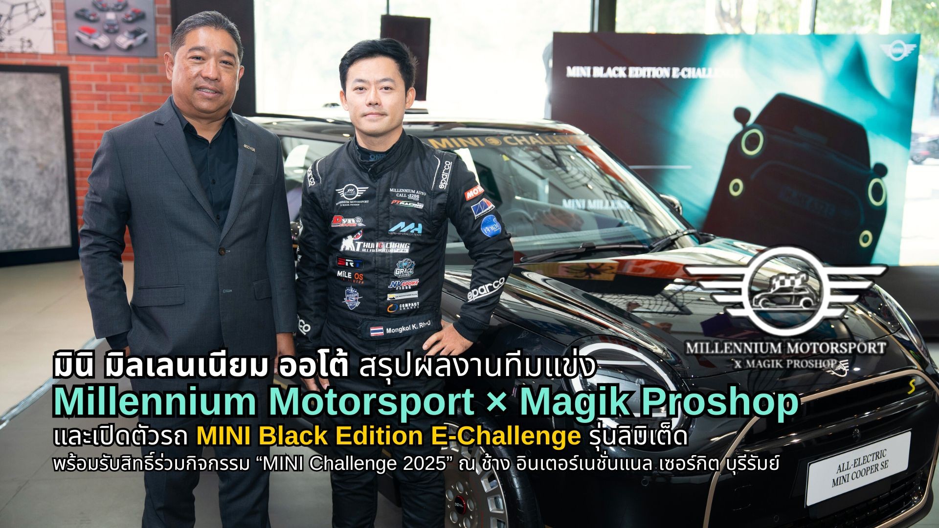 มินิ มิลเลนเนียม ออโต้ ภายใต้บริษัท มิลเลนเนียม กรุ๊ป คอร์ปอเรชั่น (เอเชีย) จำกัด (มหาชน) หรือ MGC-ASIA ผู้จำหน่ายรถยนต์มินิ (MINI) อย่างเป็นทางการในประเทศไทย จัดงานแถลงข่าวผลงานของทีมแข่ง Millennium Motorsport × Magik Proshop ประจำปี 2568 ซึ่งมีคุณเอก-มงคล คำสูง นักแข่งมืออาชีพที่มาพร้อมรถคู่ใจ MINI Cooper F56 Challenge EVO วาดลวดลายสร้างผลงานน่าประทับใจในรายการ “PT MAXNITRON RACING SERIES 2025” รวมทั้งสิ้น 7 สนาม พร้อมเปิดตัวรถมินิ (MINI) รุ่นลิมิเต็ด “MINI Black Edition E-Challenge” จำนวนจำกัด โดยได้จัดงานขึ้น ณ โชว์รูมและศูนย์บริการครบวงจรมินิ มิลเลนเนียม ออโต้ สาขาเอกมัย เมื่อวันที่ 31 ตุลาคม 2568 ที่ผ่านมา