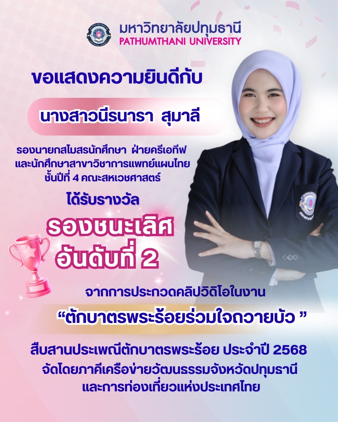 ขอแสดงความยินดี กับนางสาวนีรนารา สุมาลี รองนายกสโมสรนักศึกษา ฝ่ายครีเอทีฟ และนักศึกษาสาขาวิชาการแพทย์แผนไทย ชั้นปีที่ 4 คณะสหเวชศาสตร์ มหาวิทยาลัยปทุมธานี ที่ได้รับ รางวัลรองชนะเลิศอันดับที่ 2 จากการประกวดคลิปวิดีโอในกิจกรรม