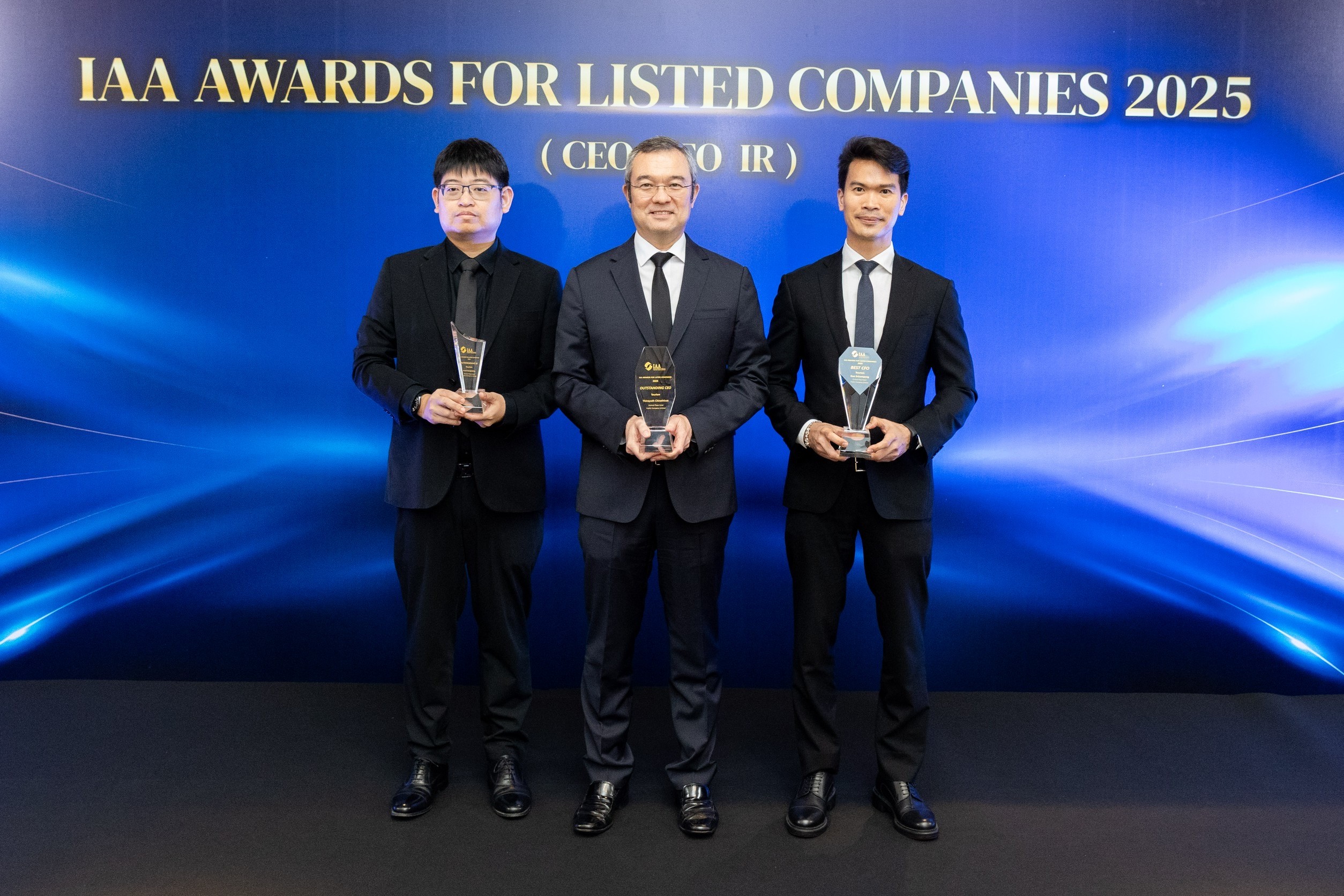 โรงแรมและรีสอร์ทในเครือเซ็นทารา คว้ารางวัล โดย ธีระยุทธ จิราธิวัฒน์ (กลาง) ประธานเจ้าหน้าที่บริหาร โรงแรมและรีสอร์ทในเครื่อเซ็นทารา ได้รับรางวัล “Outstanding CEO”, กันย์ ศรีสมพงษ์ (ขวา) ประธานเจ้าหน้าที่การเงิน และรองประธานฝ่ายการเงินและบริหาร โรงแรมฯ ได้รับรางวัล “Best CFO” และกีรติ คงคาทิพย์ (ซ้าย) ผู้ช่วยรองประธานฝ่ายการเงินและบริหารทรัพย์สิน โรงแรมฯ รับรางวัล “Outstanding IR” จากงาน IAA Awards for Listed Companies 2025 จัดโดย สมาคมนักวิเคราะห์การลงทุน โรงแรมอีสติน แกรนด์ พญาไท