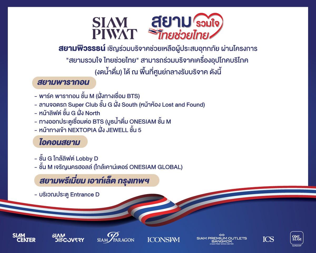 กลุ่มสยามพิวรรธน์ ผู้พัฒนาอสังหาริมทรัพย์และธุรกิจค้าปลีกชั้นนำ เจ้าของและผู้บริหาร สยามพารากอน สยามเซ็นเตอร์ สยามดิสคัฟเวอรี่ หนึ่งในพันธมิตรเจ้าของไอคอนสยาม และสยามพรีเมี่ยม เอาท์เล็ต กรุงเทพฯ เดินหน้าสานต่อปณิธานการขับเคลื่อนธุรกิจที่เอื้ออำนวยประโยชน์ให้กับผู้คน ชุมชน และสังคม ภายใต้แพลตฟอร์มแห่งโอกาสเพื่อการเติบโตของทุกคน (Well-growing Platform) ผนึกกำลังพันธมิตรทางธุรกิจ ผู้เช่า พนักงานลูกค้า และประชาชนทั่วไป เปิดศูนย์กลางรับบริจาคเครื่องอุปโภคบริโภค ภายใต้โครงการ “สยามรวมใจ ไทยช่วยไทย” เพื่อส่งกำลังใจและช่วยบรรเทาภัยความเดือดร้อนให้กับประชาชนที่ได้รับผลกระทบจากเหตุอุทกภัยภาคใต้