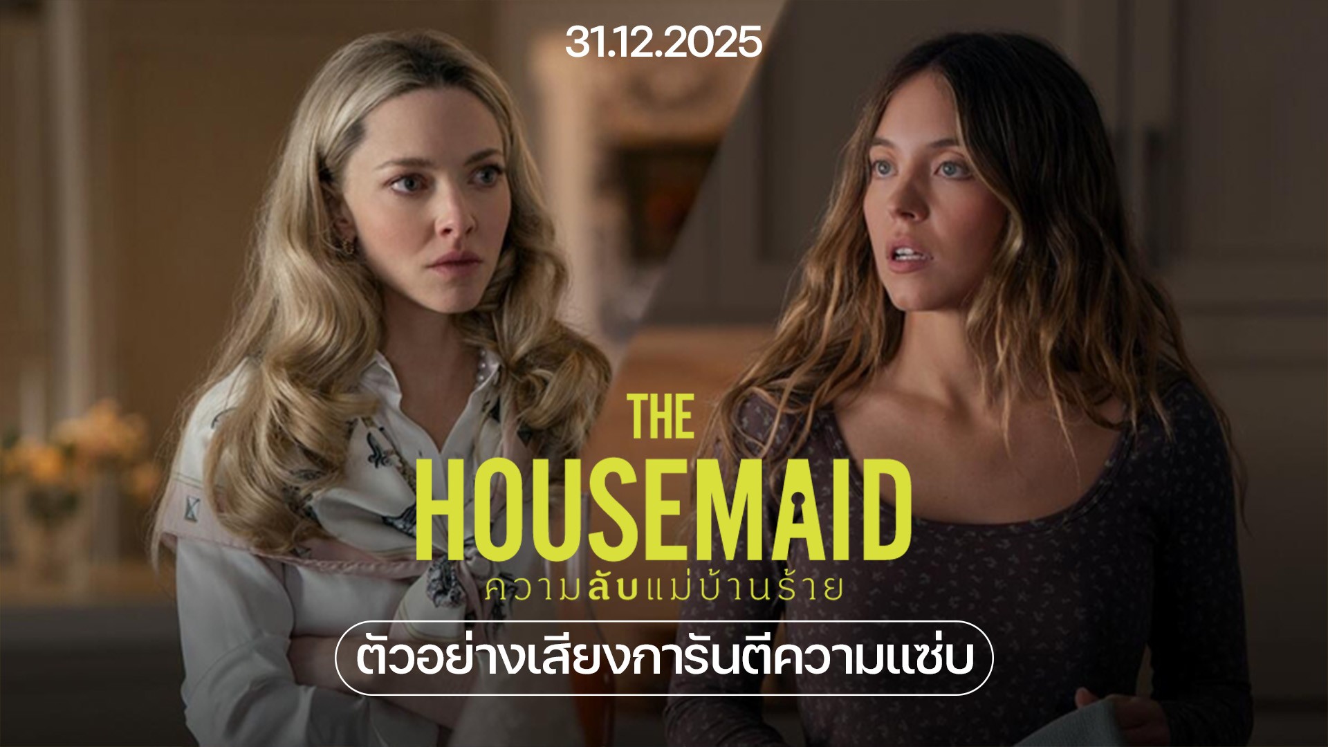 ปีใหม่นี้ “มงคลเมเจอร์” ขอชวนทุกคนมาร่วมไขปริศนาสุดสะพรึงในภาพยนตร์ทริลเลอร์สุดหฤหรรษ์ “The Housemaid ความลับแม่บ้านร้าย” พร้อมเสิร์ฟ “ตัวอย่างสุดท้าย” ที่จะมอบความบันเทิงปั่นประสาทขั้นสุดจนหยุดไม่อยู่กับการฟาดฟันของสองนักแสดงตัวแม่ “ซิดนีย์ สวีนีย์” และ “อะแมนดา ไซเฟร็ด” ที่ทั้งแซ่บทั้งคลั่งจนติดอันดับ “1 ใน 10 สุดยอดหนังแห่งปี” จาก “Entertainment Weekly”