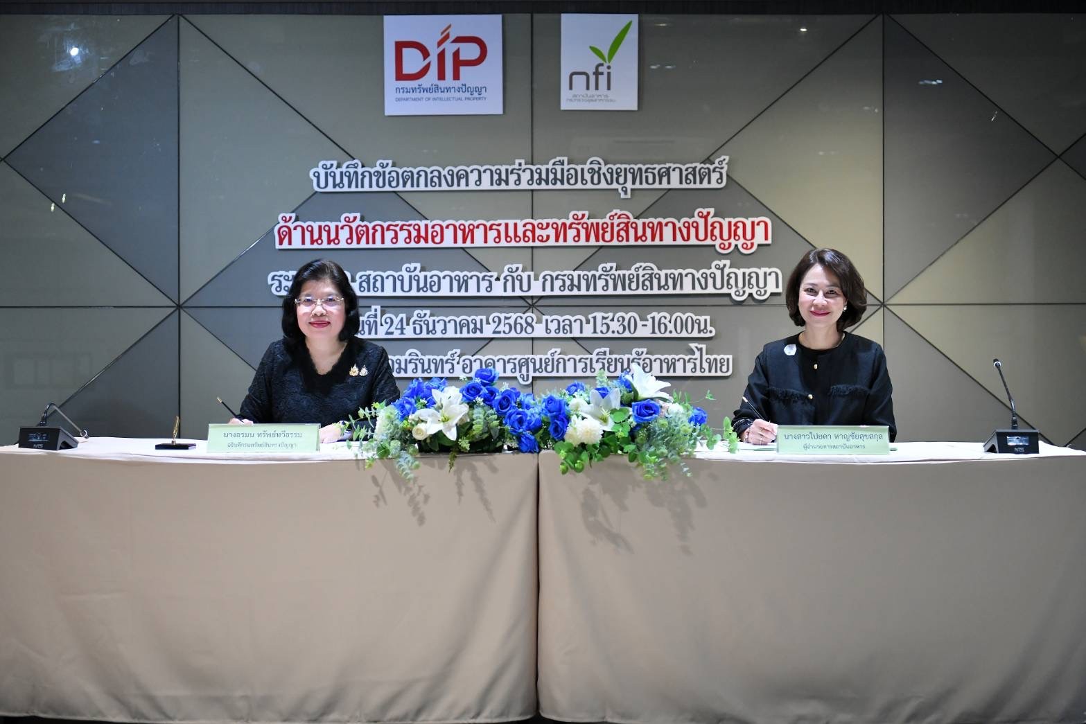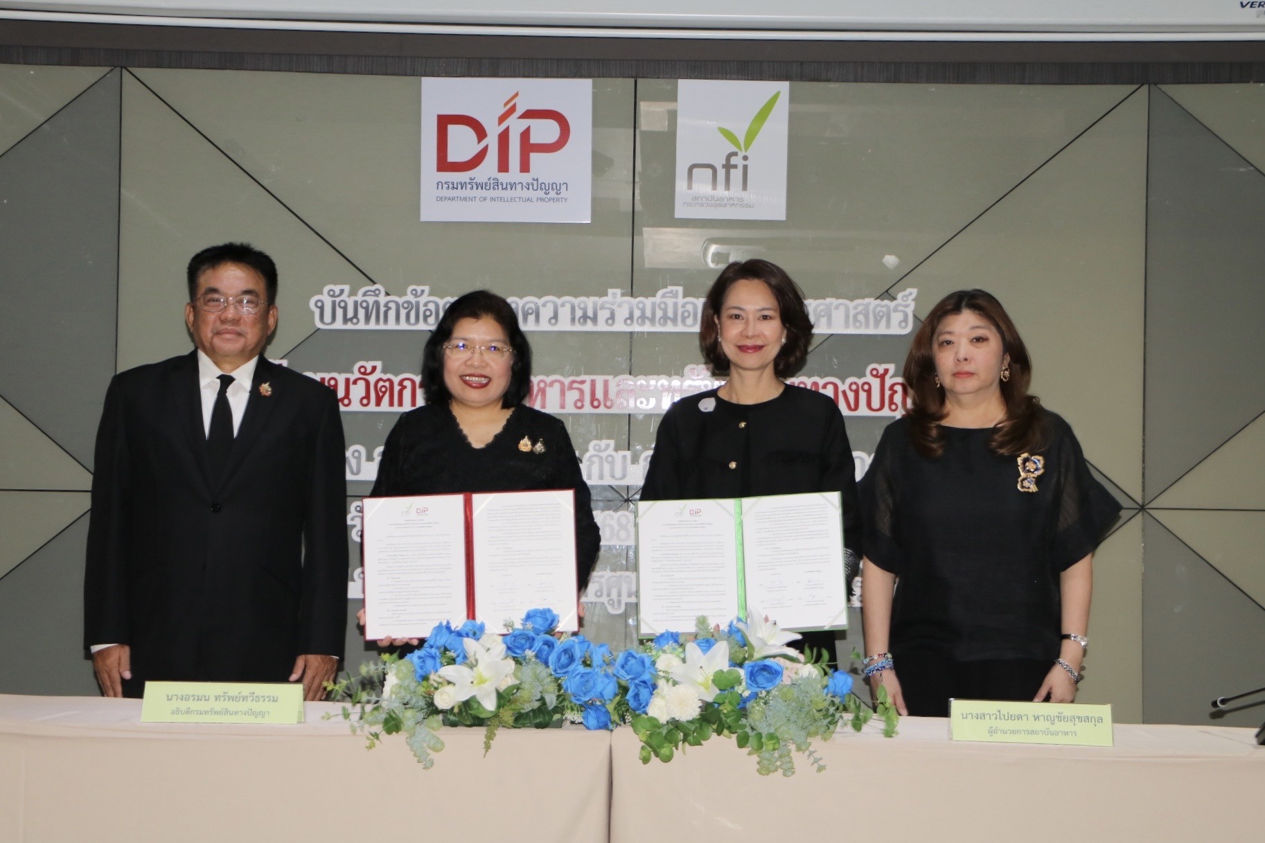 นางสาวไปยดา หาญชัยสุขสกุล ผู้อำนวยการสถาบันอาหาร และ นางอรมน ทรัพย์ทวีธรรม อธิบดีกรมทรัพย์สินทางปัญญา ร่วมลงนามบันทึกข้อตกลงความร่วมมือ (MOU) ด้านนวัตกรรมอาหารและทรัพย์สินทางปัญญา เพื่อบูรณาการความร่วมมือด้านนวัตกรรมและทรัพย์สินทางปัญญาในการสร้างมูลค่าเพิ่มให้แก่อุตสาหกรรมอาหารไทย ด้วยการส่งเสริมศักยภาพนักนวัตกรรมอาหารไทยให้มีความรู้ความเข้าใจเรื่องทรัพย์สินทางปัญญา พร้อมยกระดับนวัตกรรมอาหารไทย จาก “ผู้ผลิต” สู่ “เจ้าของนวัตกรรม”