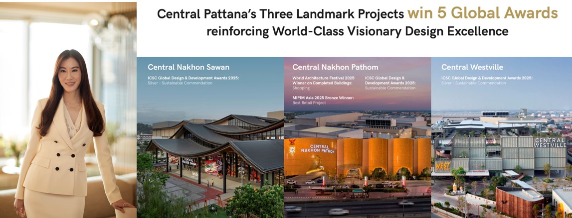 กรุงเทพฯ - บริษัท เซ็นทรัลพัฒนา จำกัด (มหาชน) ผู้นำอสังหาริมทรัพย์ไทยเพื่อความยั่งยืน ภายใต้วิสัยทัศน์ Imagining better futures for all เดินหน้ายกระดับการพัฒนาโครงการที่ผสานมิติของการออกแบบ ประสบการณ์ และการใช้พื้นที่อย่างรอบด้าน ครอบคลุมทุกธุรกิจทั้ง Retail, Residence, Hotel และ Office ล่าสุดคว้า 5 รางวัลสำคัญจาก 3 เวทีระดับโลก ได้แก่ World Architecture Festival (WAF), MIPIM Asia และ International Council of Shopping Centers (ICSC) สะท้อนศักยภาพความเป็นผู้นำอสังหาริมทรัพย์ไทย พร้อมวิสัยทัศน์ด้านดีไซน์ระดับเวิลด์คลาส จากผลงานการพัฒนาโครงการรีเทลและมิกซ์ยูสที่โดดเด่นในหลายพื้นที่ทั่วประเทศ