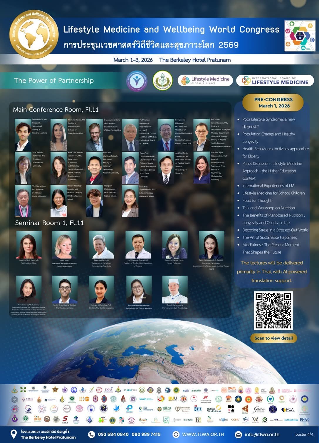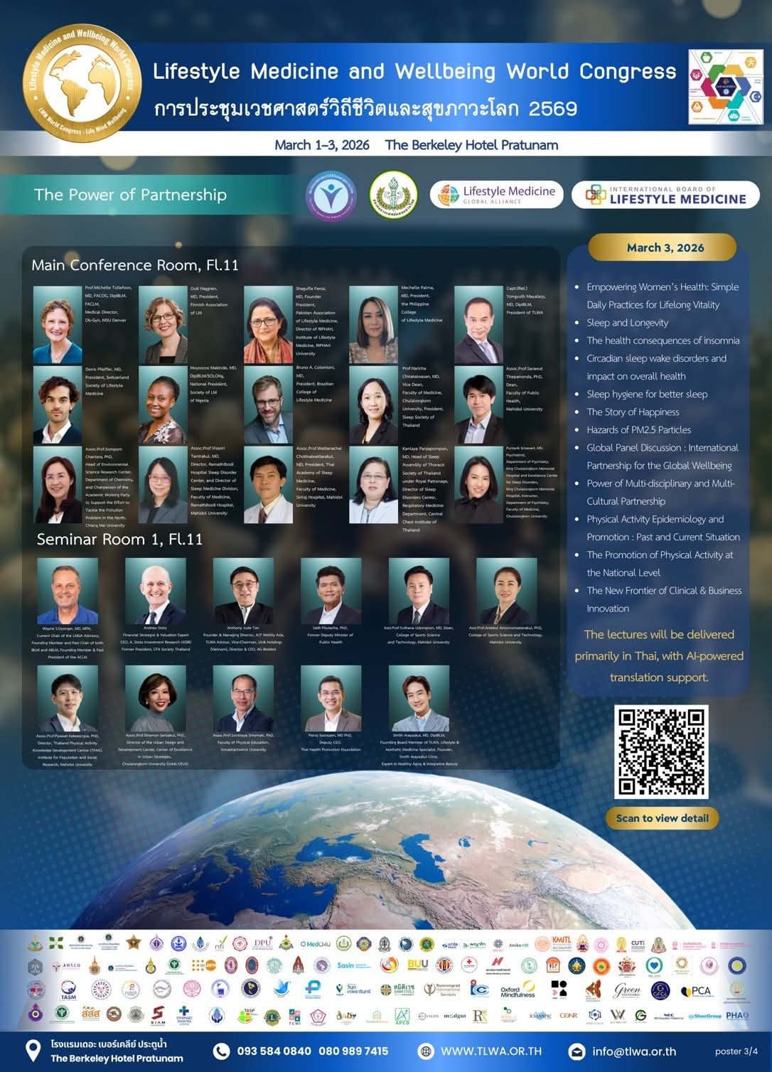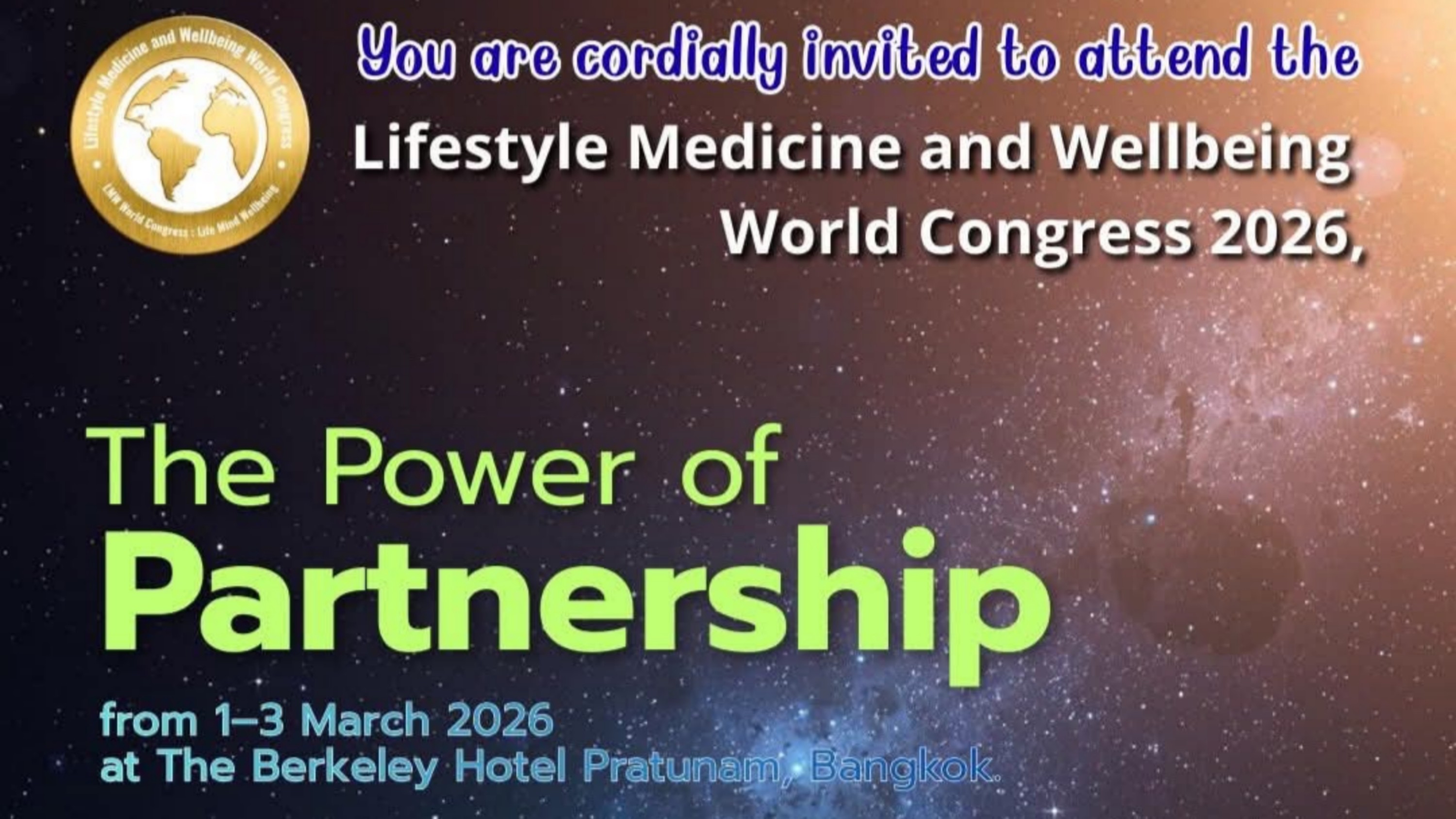 สมาคมเวชศาสตร์วิถีชีวิตและสุขสภาวะไทยขอเชิญชวนผู้สนใจเข้าร่วมประชุมระดับโลก “The Lifestyle Medicine and Wellbeing World Congress 2026: การประชุมเวชศาสตร์วิถีชีวิตและสุขสภาวะโลก 2026” ภายใต้หัวข้อ “The Power of Partnership” ซึ่งจัดขึ้นระหว่างวันที่ 1-3 มีนาคม 2569 นี้ ณ โรงแรมเดอะ เบอร์เคลีย์ ประตูน้ำ ถนนเพชรบุรีตัดใหม่ กรุงเทพมหานคร