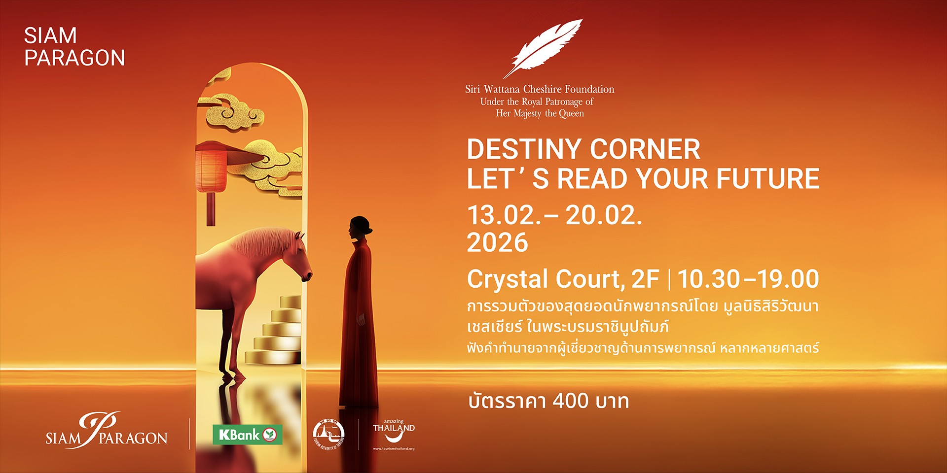 มูลนิธิสิริวัฒนา เชสเชียร์ ในพระบรมราชินูปถัมภ์ ร่วมกับ ศูนย์การค้าสยามพารากอน จัดงานรวมที่สุดของศาสตร์พยากรณ์แห่งปี “สิริวัฒนาพยากรณ์ เพื่อคนพิการ” ต้อนรับเทศกาลตรุษจีน 2569 พบสุดยอด40 นักพยากรณ์ชั้นนำผู้เชี่ยวชาญศาสตร์การทำนายหลากหลายแขนง จากทีมสิริวัฒนาพยากรณ์ มาร่วมตรวจดวงชะตา ชี้แนะแนวทางในการดำเนินชีวิตให้กับผู้ที่สนใจ ระหว่างวันที่ 13-20 กุมภาพันธ์ 2569 นี้ ณ คริสตัล คอร์ท ชั้น 2 (ฝั่งนอร์ท) สยามพารากอน ผู้สนใจซื้อบัตรพยากรณ์แบบวันต่อวันในราคาใบละ 400 บาท ที่บริเวณงาน