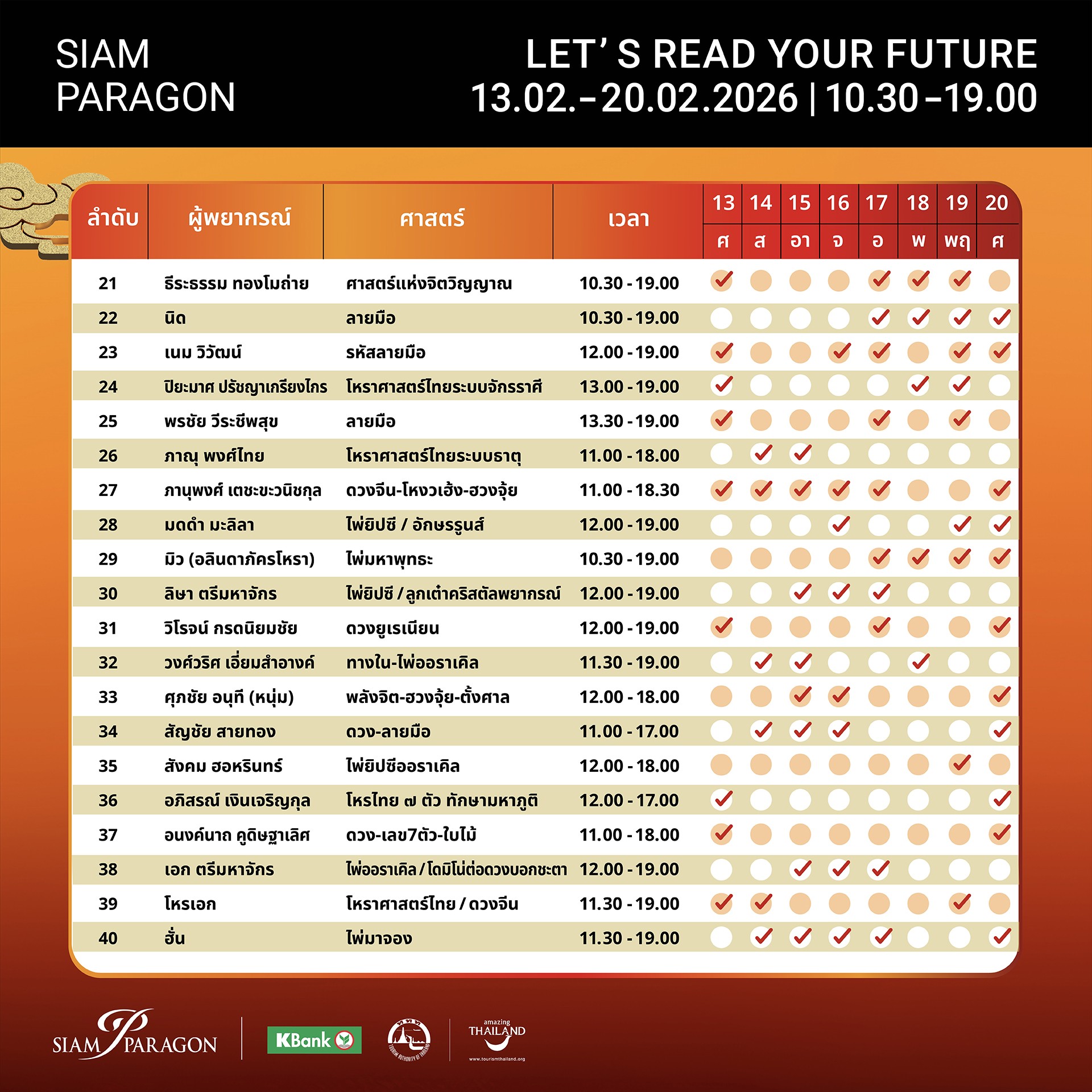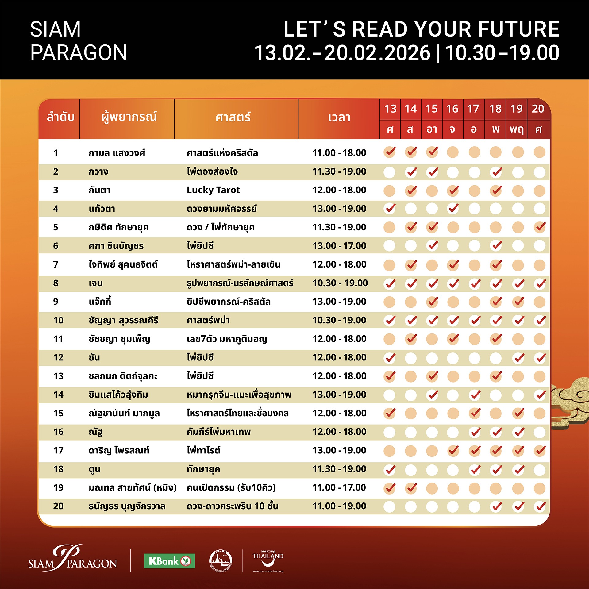 ภายในงานพบกับ 40 นักพยากรณ์ชื่อดัง ที่จะมาสลับสับเปลี่ยนหมุนเวียนทำนายโชคชะตาราศีด้วยศาสตร์ต่างๆ อาทิ อ.คฑา ชินบัญชร (ไพ่ยิปซี) , อ.กามล แสงวงศ์ (ศาสตร์แห่งคริสตัล), อ.ตูน (ทักษายุค), อ.แก้วตา (ดวงยามมหัศจรรย์), อ.กวาง (ไพ่ตองส่องใจ), อ.หมิง-มณฑล สายทัศน์ (คนเปิดกรรม), อ.สังคม ฮอห์รินทร์ (ไพ่ยิปซี), อ.ลิษา ตรีมหาจักร (ศาสตร์ลูกเต๋าคริสตัล,ทาร์โรต์ดาวเหิร),อ.วงศ์วริศ เอี่ยมสำอางค์ (ศาสตร์ไอดิน-ไอธาตุ-ไพ่ออราเคิล), อ.ใจทิพย์ สุคนธจิตต์ (โหราศาสตร์พม่า-ลายเซ็น), อ.ชัชชญา ชุมเพ็ญ (ศาสตร์เลข 7 ตัว มหาภูติมอญ), อ.ชัญญา สุวรรณคีรี (ศาสตร์พม่า), อ.เจน (ศาสตร์ธูปพยากรณ์-นรลักษณ์ศาสตร์) และ โหรเอก (โหราศาสตร์ไทยระดับสูง), ซินแสโค้วสุ่งกิม (ศาสตร์หมากรุกจีน), อ.มดดำ มะลิลา (ศาสตร์อักษรรูนส์-ไพ่ยิปซีคาราวาน) , อ.ปิยะมาศ ปรัชญาเกรียงไกร (โหราศาสตร์ไทยระบบจักรราศี), ดาริญ ไพรสณฑ์ (ไพ่ทาโร่ต์), อ.นิด (ลายมือ), เนม วิวัฒน์ (รหัสลายมือ), อ.ธีระธรรม ทองโมถ่าย (ศาสตร์แห่งจิตวิญญาณ) เป็นต้น