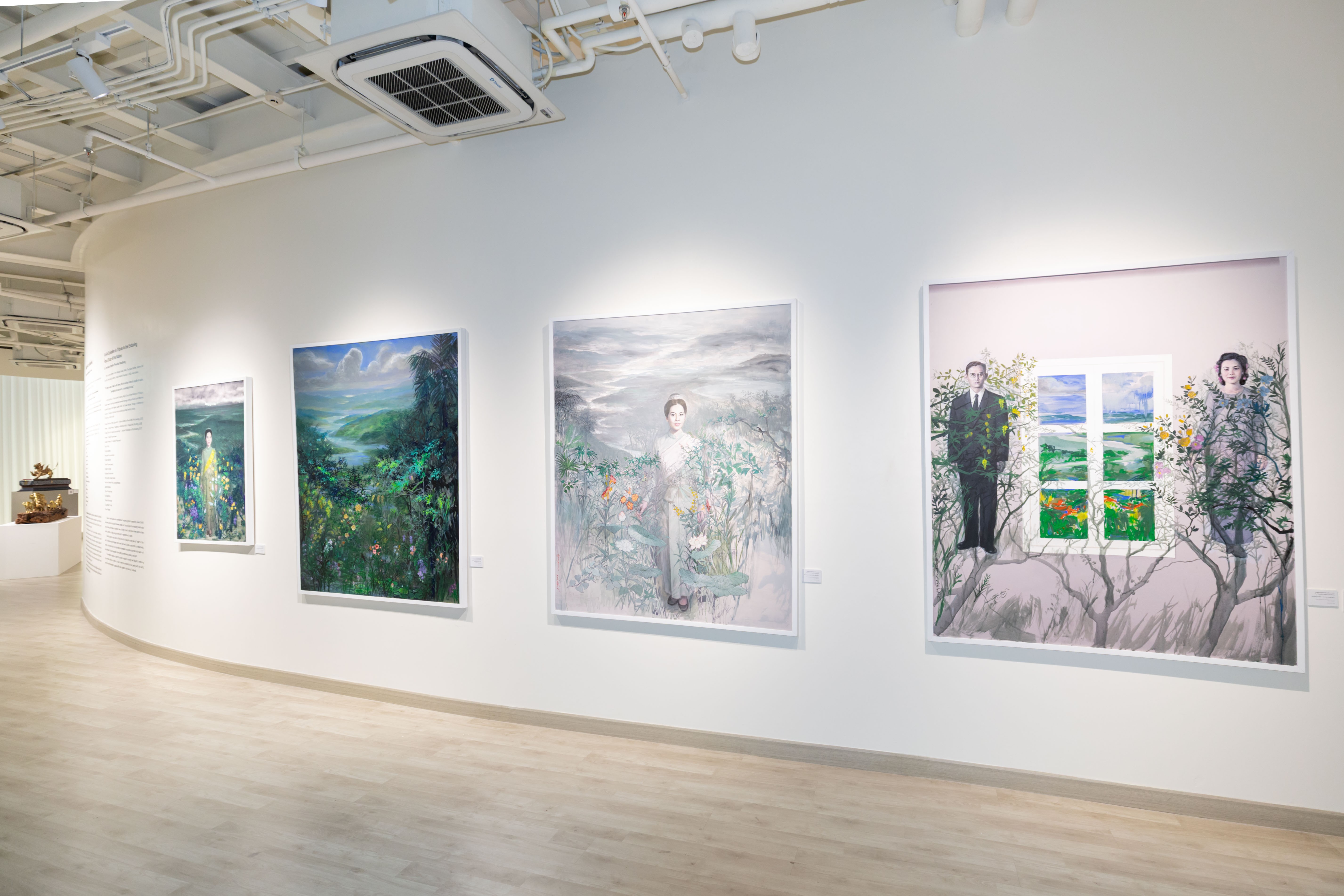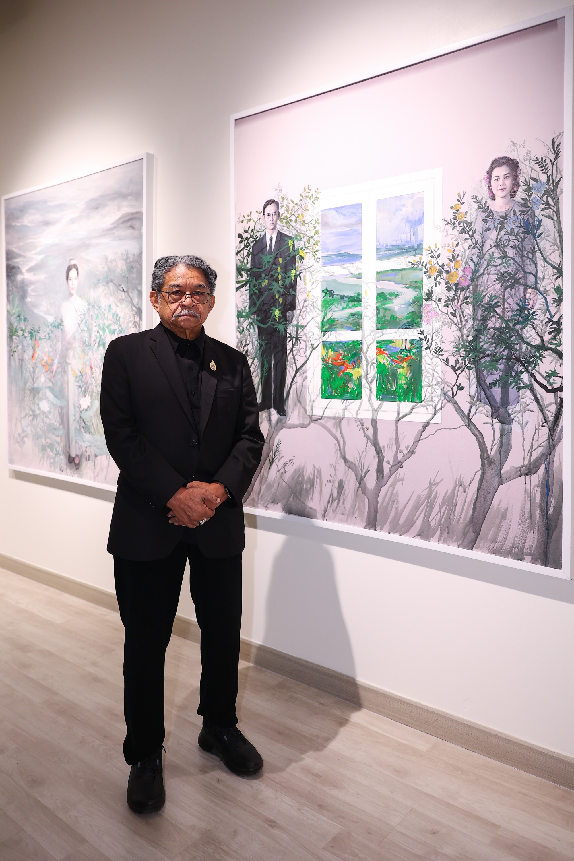 The exhibition “An Art Exhibition in Tribute to the Enduring Royal Grace of the Nation” by Professor Emeritus Preecha Thaothong, National Artist in Visual Arts (Painting, 2009), features works inspired by the royal statement: “The King is the water, I am the forest.” This concept reflects the harmonious and mutually supportive partnership in the royal duties of His Majesty Bhumibol Adulyadej the Great and Her Majesty Queen Sirikit The Queen Mother. Professor Preecha conveys this concept through the theme of ‘human development,’ portraying people as trees in a forest that require the right amount of water to grow strong and flourish. This idea aligns with Royal initiatives, the Sufficiency Economy Philosophy, and the principle of nurturing human potential from within. Accordingly, the exhibition is not simply a display of royal portraiture, but a space for interpreting royal aspirations through art, reflecting the sustainable development of people, culture, and the nation.