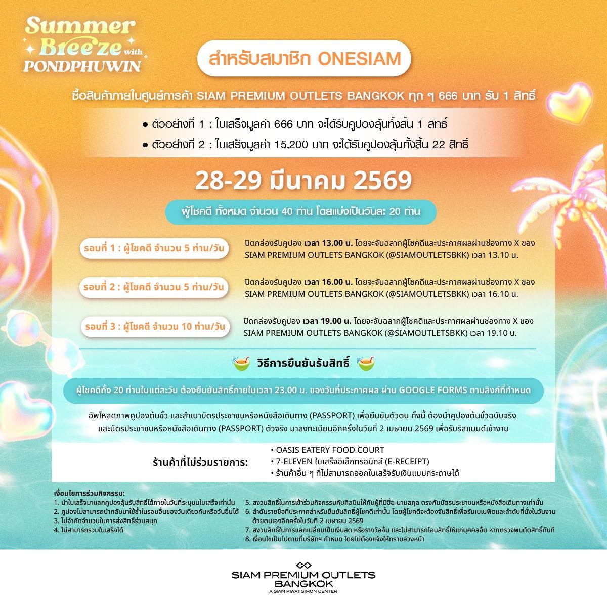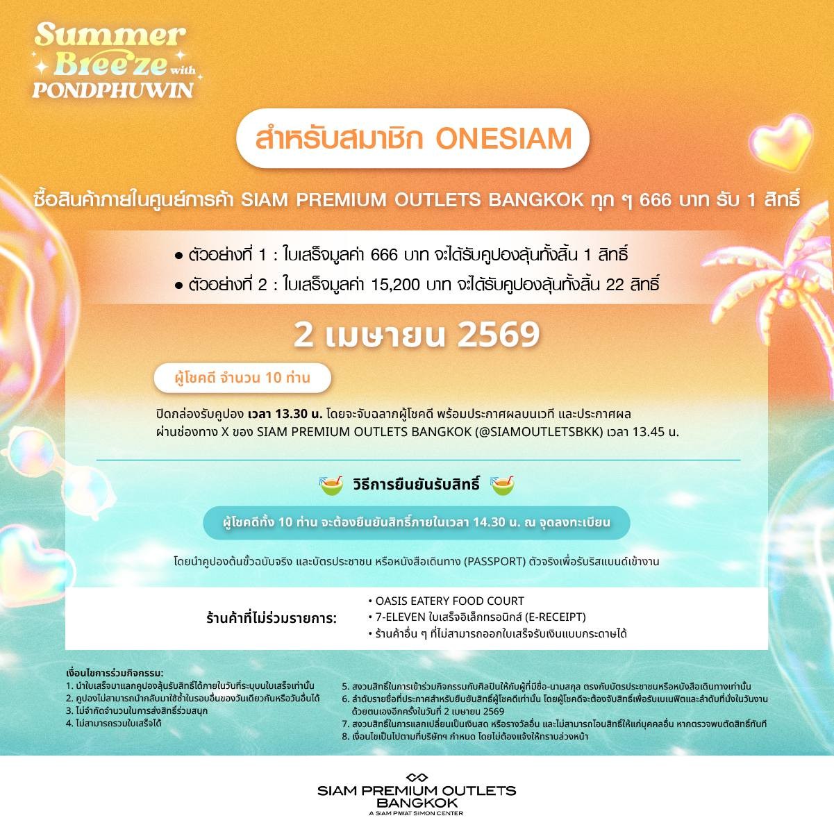 สมาชิก ONESIAM ร่วมลุ้นเป็น 1 ใน 50 LUCKY FANS เข้าร่วมกิจกรรมสุดพิเศษพร้อมรับของขวัญเอ็กซ์คลูซีฟจากสองหนุ่ม “ปอนด์ – ภูวินทร์” เพียงช้อปภายในศูนย์การค้า SIAM PREMIUM OUTLETS BANGKOK ทุก 666 บาท ต่อใบเสร็จ รับ 1 สิทธิ์ โดยลงทะเบียนเข้าร่วมแคมเปญ SUMMER BREEZE X PONDPHUWIN ผ่าน ONESIAM SuperApp เฉพาะวันที่ 28 - 29 มีนาคม 2569 และ 2 เมษายน 2569 เพียง 3 วันเท่านั้น! ยิ่งช้อปมาก ยิ่งเพิ่มโอกาสที่จะได้ใกล้ชิดศิลปินที่คุณชื่นชอบมากขึ้น