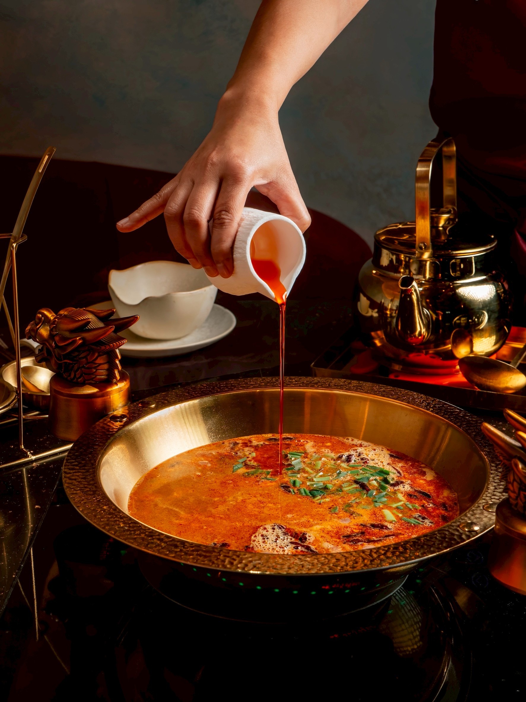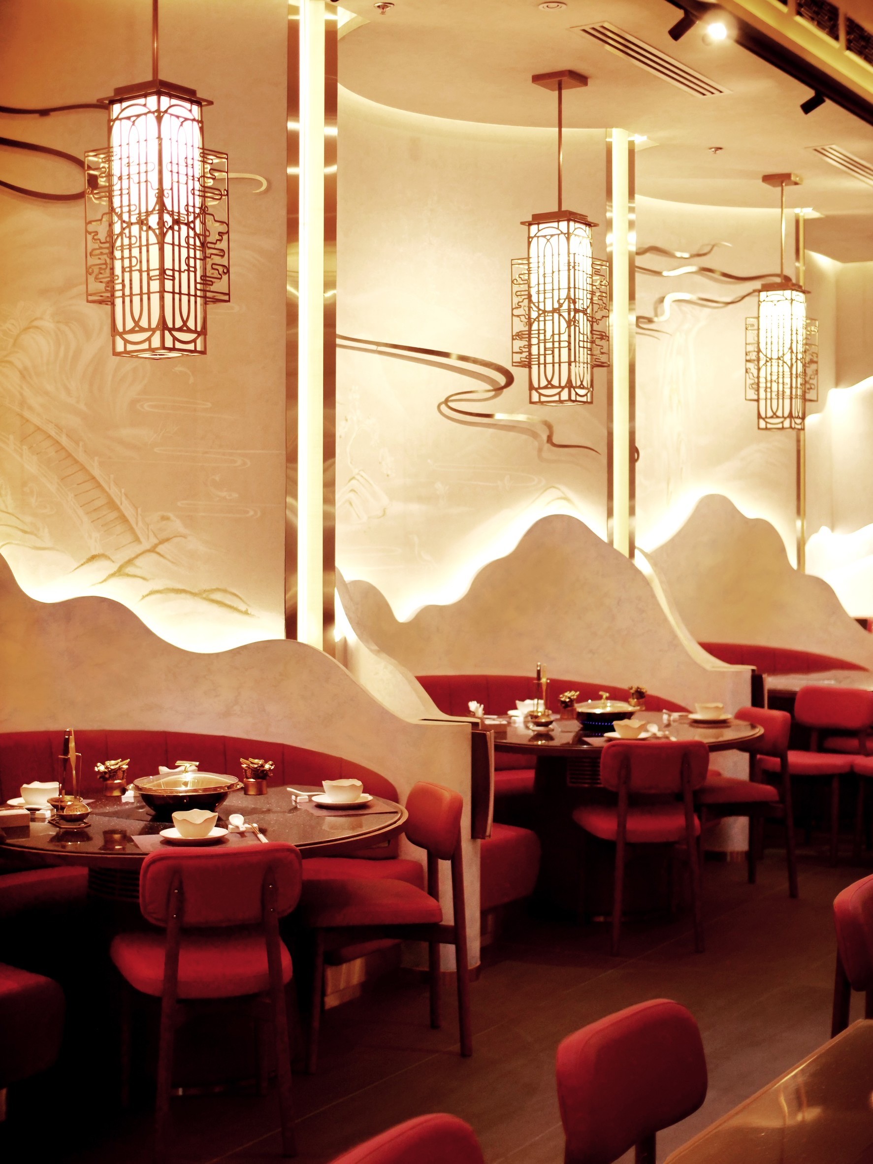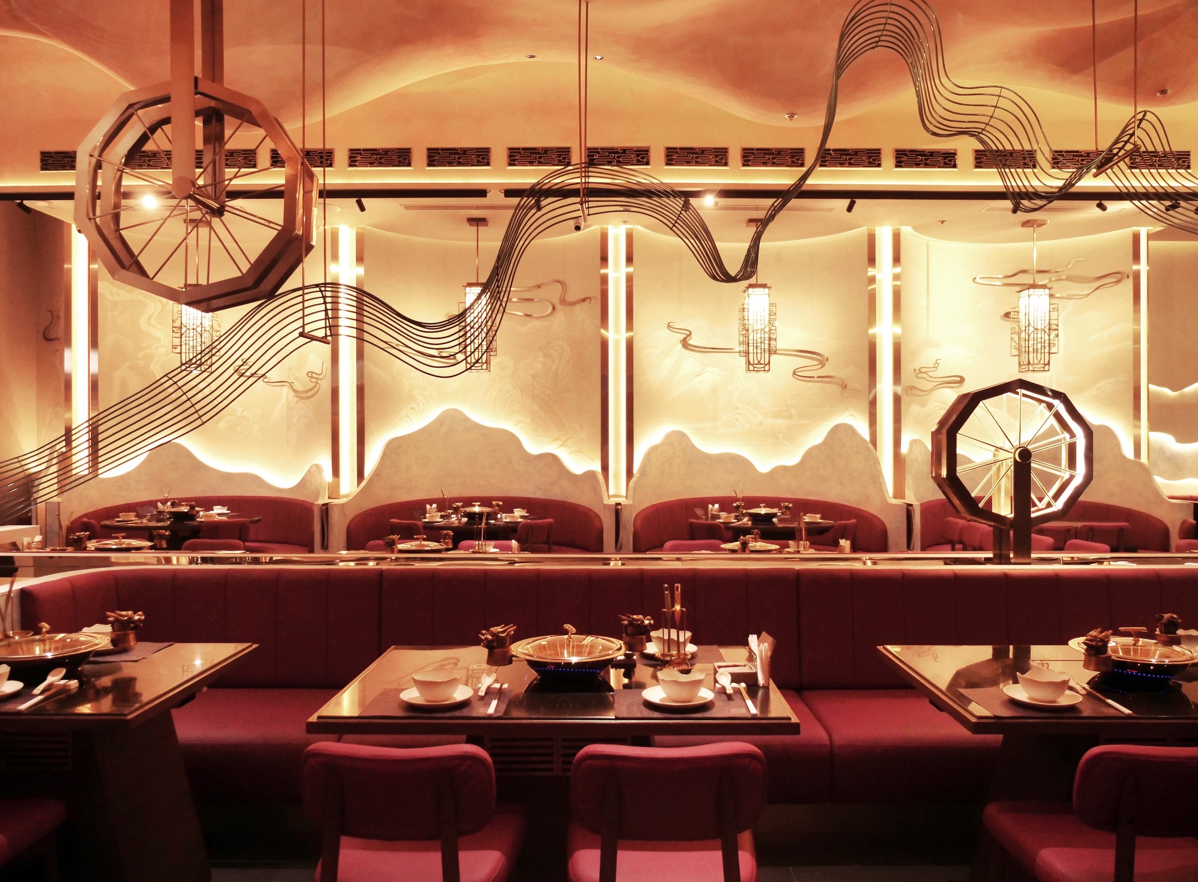 ด้านการออกแบบภายในร้านสะท้อนตำนานและความประณีตของแบรนด์ผ่านโทนสีทองและแดงที่สื่อถึงความพรีเมียม จุดเด่นกลางร้านเป็น Modern Art Installation ที่ได้แรงบันดาลใจจากเส้นบะหมี่หยก ผสมผสานกับลวดลายของทิวเขาบนผนัง เพดานออกแบบโค้งมนคล้ายเมฆบนท้องฟ้า
