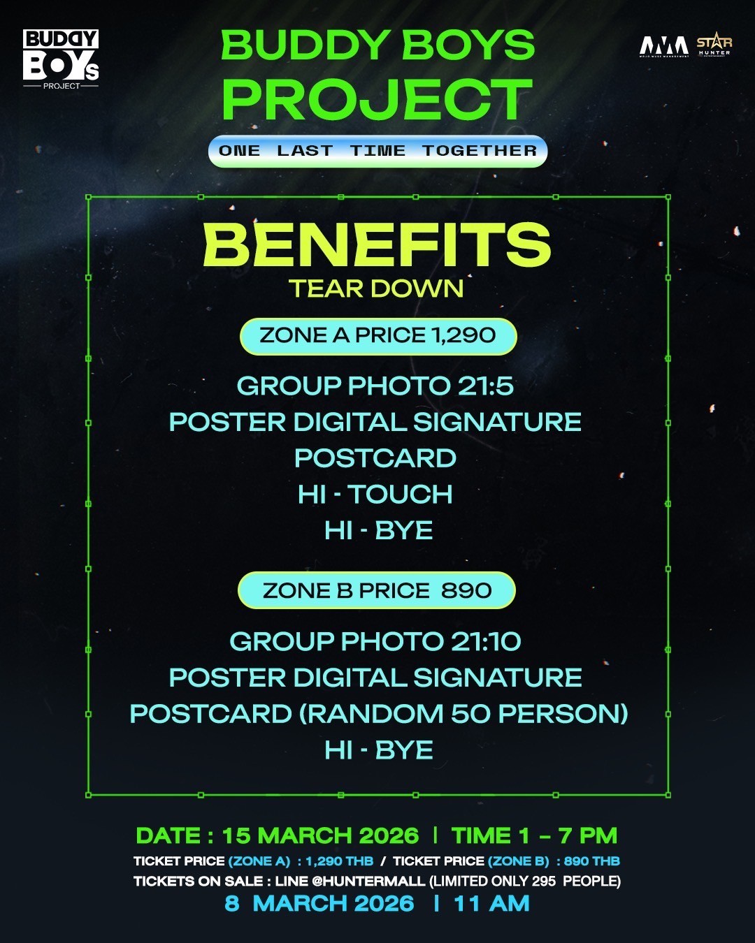 ที่สำคัญ ผู้ร่วมงานเพียง 295 คนเท่านั้น ยังมีสิทธิ์รับ Benefits สุดคุ้ม ไม่ว่าจะเป็น Photo Group, Hi-Touch, Hi-Bye, Poster Digital Signature และ Postcard สุดเอ็กซ์คลูซีฟ รวมถึงการจำหน่าย Merchandise เสื้อยืดลิมิเต็ด ของ รายการ BUDDY BOYs PROJECT เพียง 100 ตัว
