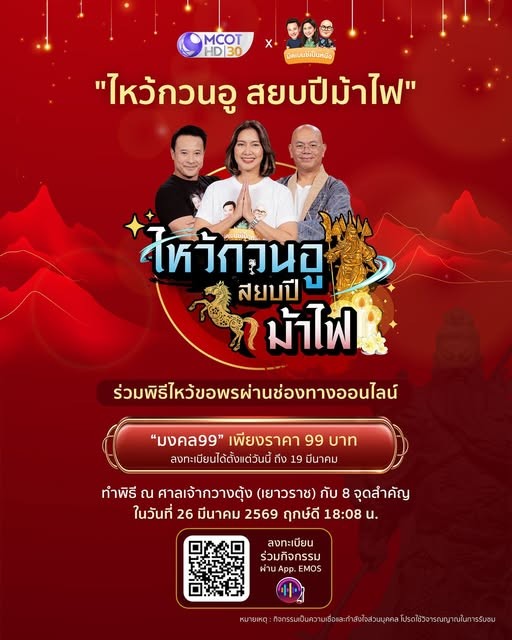 “ใครหลายคนอยากจะสยบม้าไฟ อยากสยบเรื่องราวสิ่งที่เป็นปัญหา อยากจะสยบเรื่องราวต่าง ๆ ไม่ว่าจะเป็นหนี้สิน การงานการเงินทุกเรื่องราว ต้องมากราบสักการะเทพเจ้ากวนอู เพราะม้าเป็นพาหนะคู่ใจของท่าน และการไปรบในทุก ๆ ครั้ง ม้าเองก็จะคู่กันไปมีชัยชนะมากมาย ซึ่งปีนี้เป็นปีม้า เราพลาดไม่ได้ ที่จะมากราบสักการะองค์เทพเจ้ากวนอูเพื่อจะสยบปีม้าไฟ ให้เรามีการงานที่ดี การเงินที่ดี ความรักที่ดี สุขภาพที่ดีและมีเรื่องราวดี ๆ ตลอดทั้งปี โดยอาจารย์จะพาทุกคนมากราบสักการะ เทพเจ้ากวนอู ณ ศาลเจ้ากวางตุ้ง ที่เยาวราช ซึ่งศาลเจ้าแห่งนี้ไม่ธรรมดา มีเรื่องราวดี ๆ มากมาย อายุกว่า 100 ปี มีประตูมังกร 3 บาน มีหลายจุดที่ใครหลายคนมาขอเรื่องการศึกษา หลายคนมาขอเรื่องธุรกิจการค้า และหลายคนมาขอเรื่องการพลิกชีวิตในเรื่องธุรกิจต่าง ๆ และสำเร็จมานักต่อนัก ซึ่งหลายคนอยากมาแบบนี้ หลายคนอยากมาสักทริปนึงแต่อยู่ต่างจังหวัด เราจัดให้ทุกคนได้สะดวกในการรับสิ่งดี ๆ เพียงลงทะเบียนร่วมกิจกรรมได้เลยทาง https://emos.in.th/DownloadApp อาจารย์จะนำ ชื่อ-นามสกุล และคำอธิษฐาน ตามที่ได้ลงทะเบียนไว้ร่วมพิธีในแต่ละจุด โดยทุกคนสามารถร่วมตั้งจิตอธิฐานนึกถึงสิ่งดี ๆ ไปพร้อมกันได้ในวันพฤหัสบดีที่ 26 มีนาคมนี้ ฤกษ์ดีเวลา 18.08 นาที” อาจารย์เป็นหนึ่งเผย