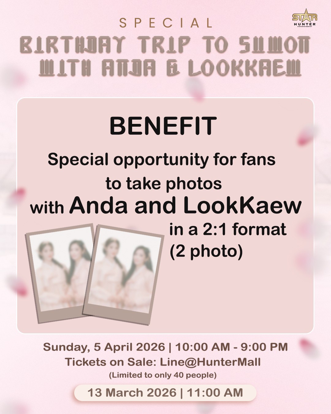 ความพิเศษของทริปนี้ยังไม่หมด เพราะแฟน ๆ จะได้รับ โอกาสสุดเอ็กซ์คลูซีฟในการถ่ายภาพกับ อันดา และ ลูกแก้ว แบบ 2:1 จำนวน 2 ภาพ เก็บเป็นความทรงจำสุดพิเศษในช่วงเดือนเกิดของทั้งสองสาว เรียกได้ว่าเป็นโมเมนต์ใกล้ชิดที่หาไม่ได้จากที่ไหน