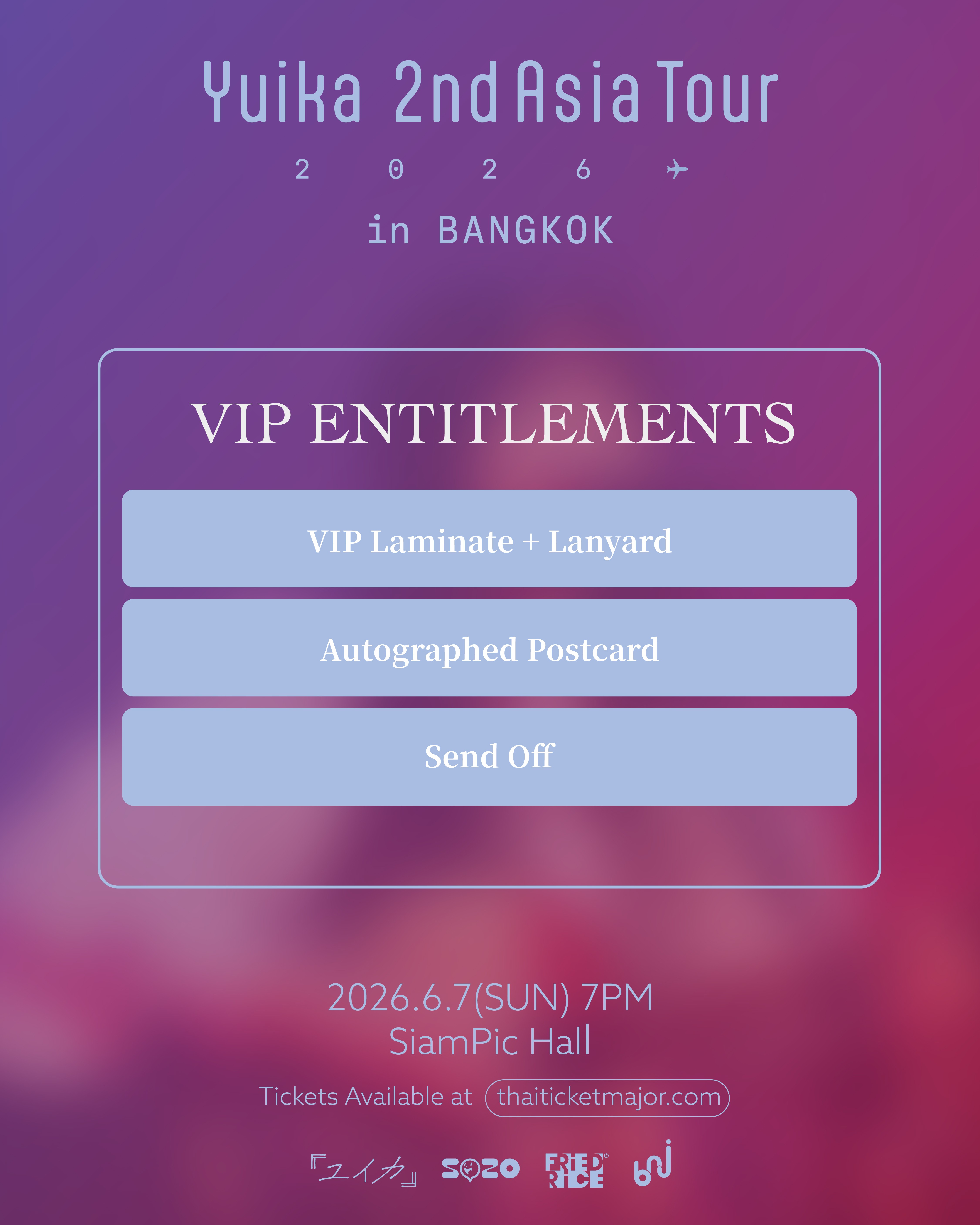 สำหรับการมาเยือนประเทศไทยครั้งนี้ แฟนเพลงจะได้สัมผัสเสน่ห์ของเสียงร้องที่เป็นเอกลักษณ์ ไม่ว่าจะเป็นเพลงฮิตที่ทำให้เธอเป็นที่รู้จัก รวมถึงบทเพลงจากอัลบั้มแรก ที่จะถูกถ่ายทอดผ่านการแสดงสดอย่างใกล้ชิดในบรรยากาศสุดพิเศษ ค่ำคืนแห่งเสียงดนตรีและเรื่องราวความรักในแบบของ Yuika (ยูอิกะ) กำลังจะเกิดขึ้นที่กรุงเทพฯ และรับรองว่าจะเป็นอีกหนึ่งคอนเสิร์ตที่แฟน J-POP ไม่ควรพลาด!! แฟน ๆ ที่ไม่อยากพลาด สามารถเตรียมตัวจับจองบัตรได้ในวันเสาร์ที่ 28 มีนาคม 2569 เวลา 10.00 น. เป็นต้นไป ผ่านทางเว็บไซต์ Thaiticketmajor บัตรราคา VIP 5,800 บาท / 4,500 บาท / 3,200 บาท