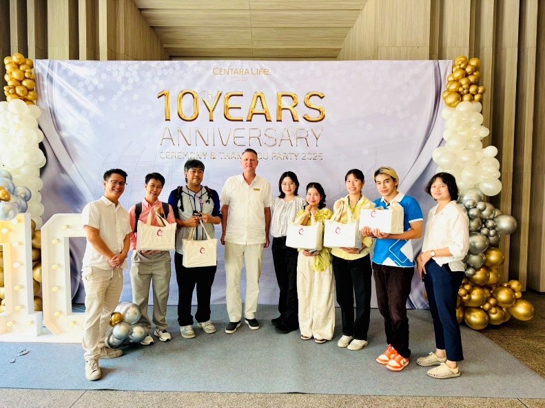 เซ็นทารา ไลฟ์ มาริส รีสอร์ท จอมเทียน นำโดย โจนัส เฮอร์สเต็ด (ที่ 4 จากซ้าย) ผู้จัดการทั่วไปภาคพื้นที่ และธ ธฤตา ศุภศดิศ (ที่ 5 จากซ้าย) ผู้จัดการโรงแรม จัดพิธีทำบุญโรงแรมเนื่องในโอกาสฉลองครบรอบ 10 ปี พร้อมมอบของที่ระลึกสุดพิเศษให้แก่แขกผู้เข้าพัก เพื่อเป็นการแสดงความขอบคุณและคืนกำไรให้กับลูกค้าจากทั่วทุกมุมโลก และเฉลิมฉลองความสำเร็จของโรงแรมในปีที่ 10