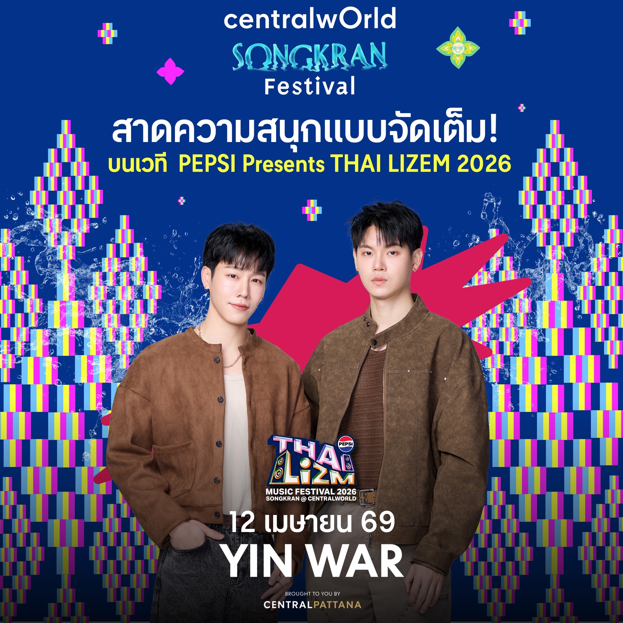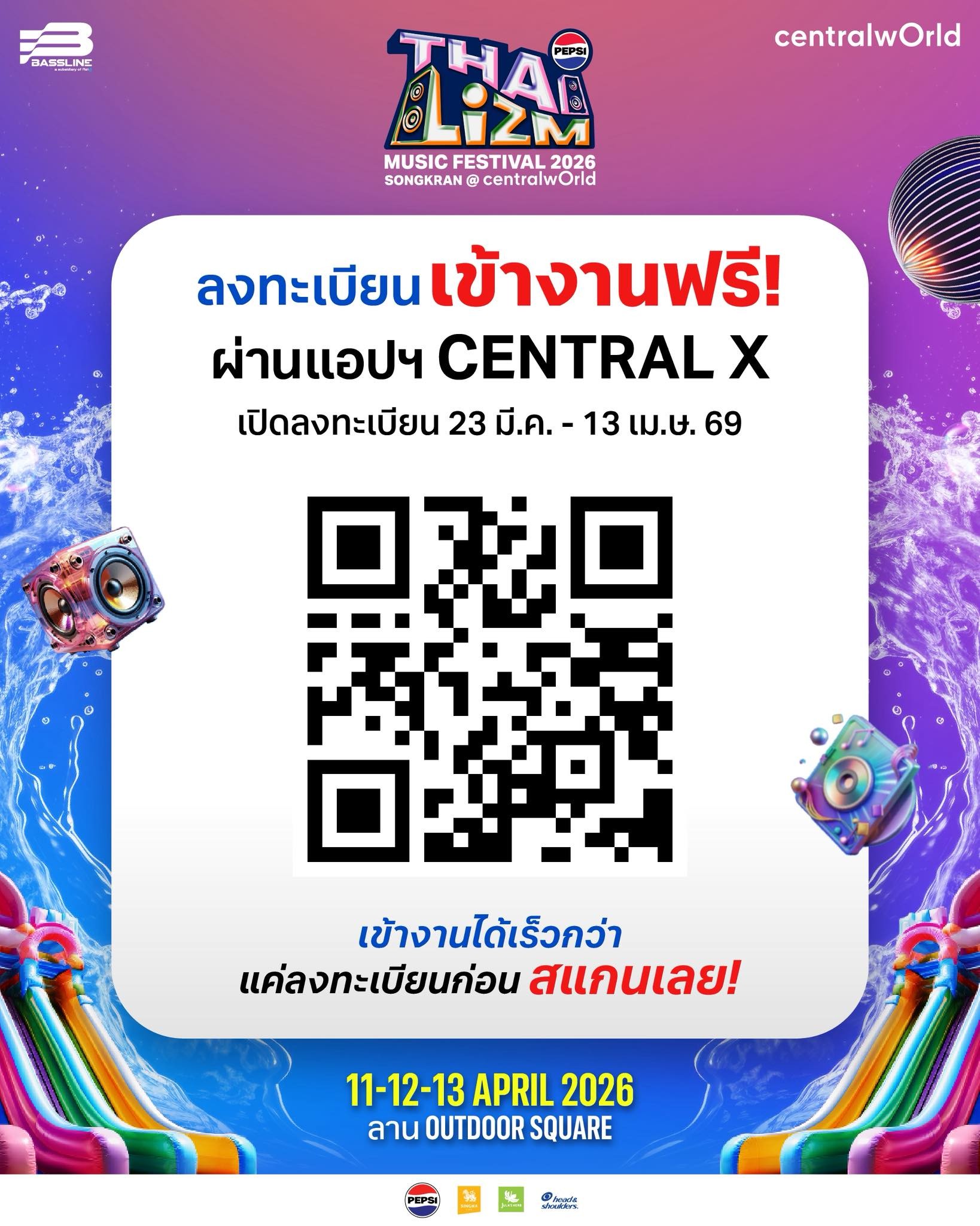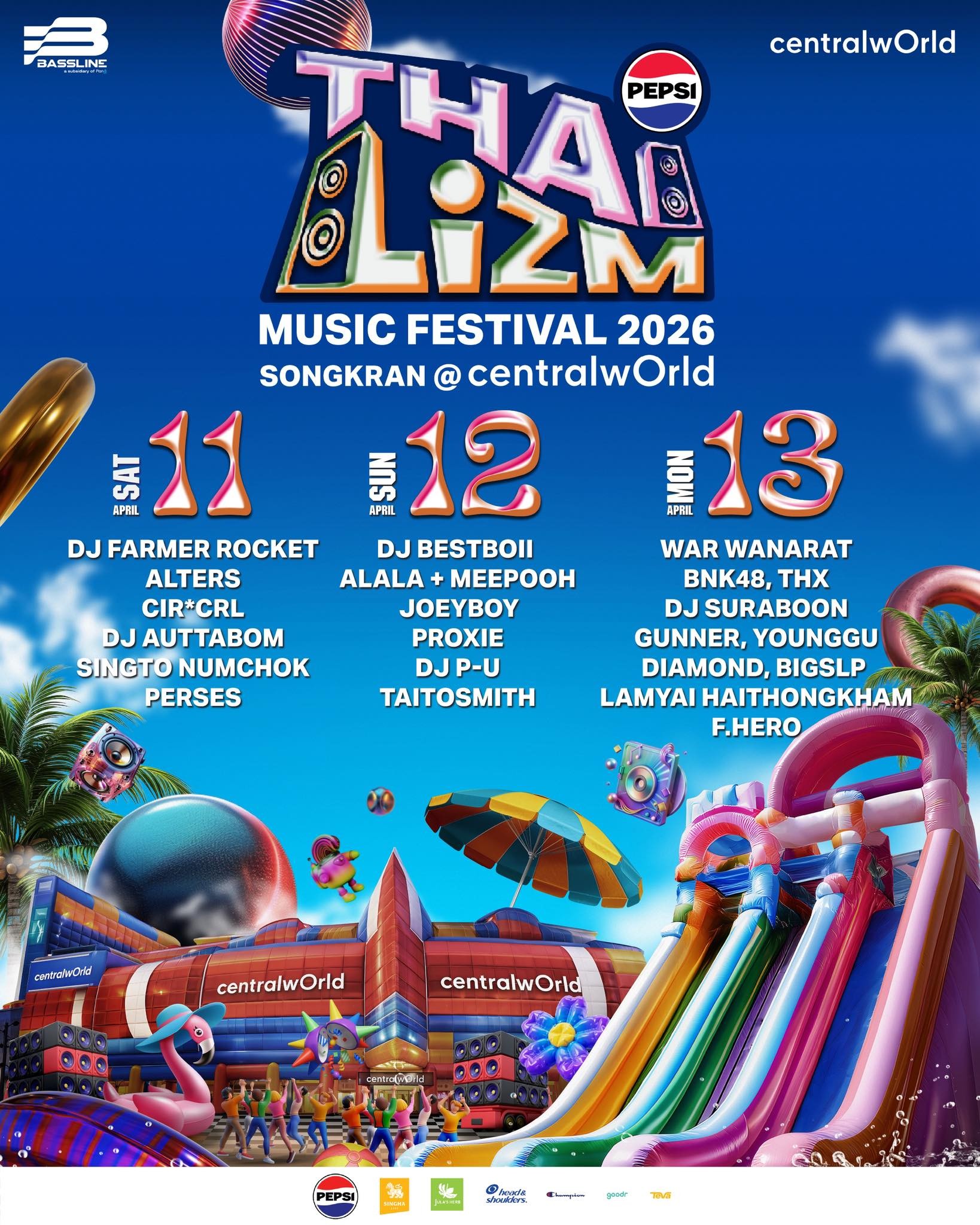 ความสนุกพุ่งสุดที่ “PEPSI Presents THAI LIZM 2026” เมื่อ ‘เซ็นทรัลเวิลด์’ ผนึกกำลัง บริษัท เบสไลน์ เอ็นเตอร์เทนเมนต์ บริษัทในเครือของ PlanB Media จับมือการท่องเที่ยวแห่งประเทศไทย และพันธมิตรชั้นนำ ได้แก่ บริษัท ซันโทรี่ เป๊ปซี่โค เบเวอเรจ (ประเทศไทย) จำกัด, การท่องเที่ยวแห่งประเทศไทย (ททท.), สิงห์ ไลฟ์, บริษัท เจแอลซี กรุ๊ป จำกัด (จุฬาเฮิร์บ), บริษัท พรอคเตอร์ แอนด์ แกมเบิล เทรดดิ้ง (ประเทศไทย) จำกัด, บริษัท เรฟ อีดิชั่น จำกัด สร้างปรากฏการณ์ดนตรีที่สนุกที่สุดในประเทศไทย ยกเวทีคอนเสิร์ตมาไว้ใจกลางกรุงเทพฯ กับสงกรานต์ยกหาดสาดคลื่นปาร์ตี้ ที่จะทำให้คุณ “เปียกแบบป๊อปๆ” พร้อมไลน์อัปศิลปินและดีเจแน่นตลอด 3 วัน