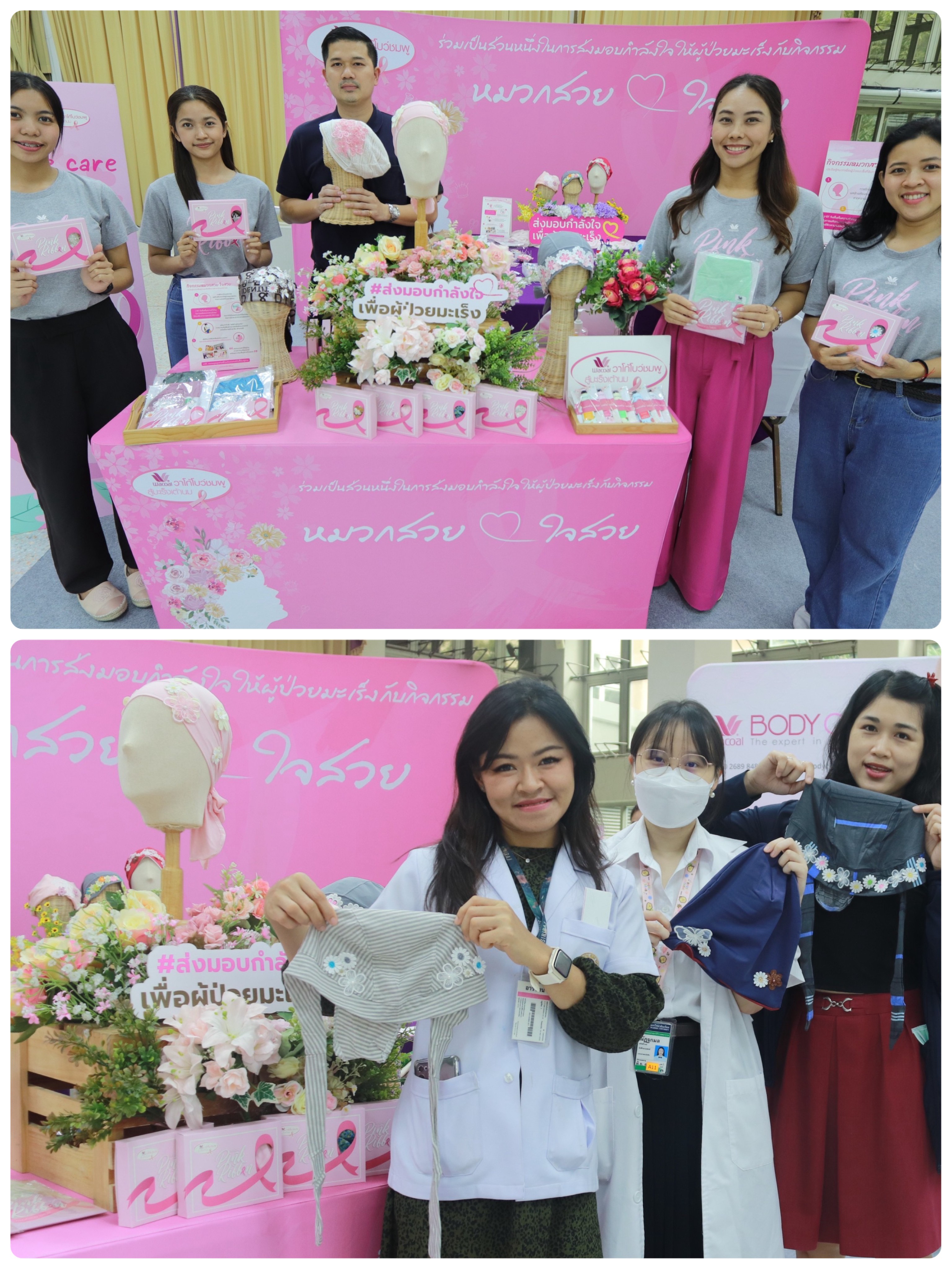 2. จัดทำหมวกเพื่อมอบให้กับผู้ป่วยมะเร็งเต้านมที่อยู่ระหว่างการรักษาตัวด้วยเคมีบำบัด โดยมอบผ่านตัวแทนโรงพยาบาล จำนวน 9 แห่ง โรงพยาบาลละ 300 ใบ รวมเป็นมูลค่าเงินของการสนับสนุนโรงพยาบาลละ 100,000 บาท