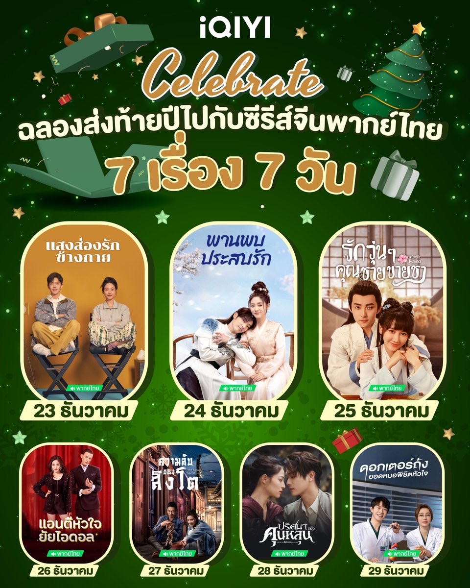 iQIYI (อ้ายฉีอี้) เจ้าตลาดซีรีส์จีน ที่ตลอดทั้งปีได้ส่งมอบความสุขกับการส่งซีรีส์จีนครบทุกรสชาติ ไม่ว่าจะเป็นแนว โรแมนติก , ดราม่า , คอเมดี้ , สืบสวนสอบสวน และแฟนตาซี ที่เรียกได้ว่าทุกเรื่องต่างได้รับกระแสตอบรับที่ดีและถูกพูดถึงอย่าง วงกว้าง ล่าสุด iQIYI (อ้ายฉีอี้) ขอส่งมอบของขวัญส่งท้ายปีกับการเปิดตัวแคมเปญสุดยิ่งใหญ่ iQIYI Celebrate กับการเสิร์ฟซีรีส์จีนพากย์ไทยเรื่องใหม่ 7 เรื่อง 7 วัน ซีรีส์ที่จะทำให้ปีนี้ของคุณพิเศษมากกว่าเดิม รับชมพากย์ไทยแบบจุใจตั้งแต่วันที่ 23 – 29 ธันวาคมนี้ พร้อมทั้งใจปล้ำแจกส่วนลด iQIYI VIP 1 เดือน กว่า 100,000 โค้ด เพียงกรอกโค้ด iQIYICELEBRATE ผ่านทางเว็บไซต์https://www.iq.com/vip/order ก็รับไปเลยส่วนลด 90 บาท สำหรับลูกค้าใหม่ สมัคร iQIYI VIP เดือนแรกเพียง 29 บาท จากราคาปกติ 119 บาท โดยสามารถใช้โค้ดได้ตั้งแต่ 23 - 31 ธันวาคมนี้ ซึ่งจะมีซีรีส์พากย์ไทยเรื่องไหนบ้างนั้นตามไปดูกันเลย!