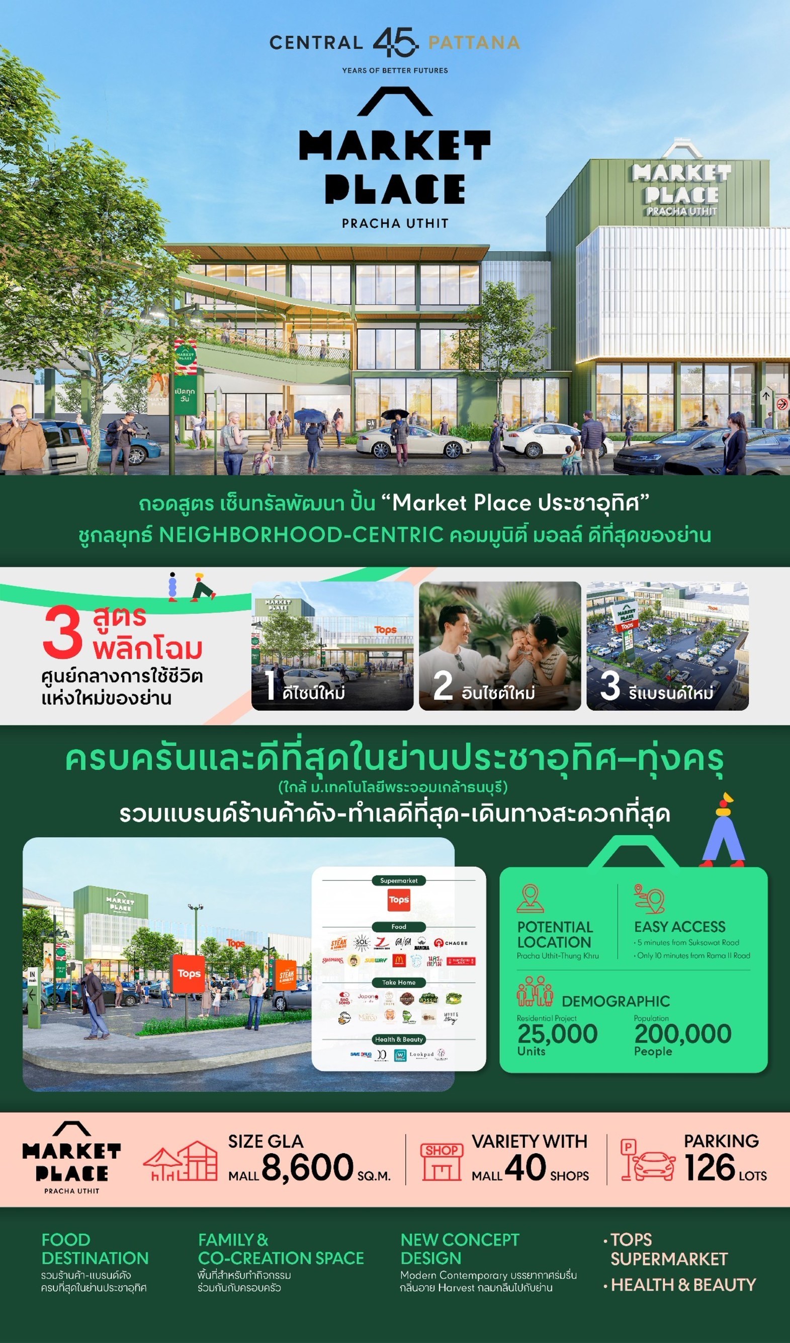 นายวุฒิเกียรติ เตชะมงคลาภิวัฒน์ Chief Operating Officer บมจ. เซ็นทรัลพัฒนา กล่าวว่า “เซ็นทรัลพัฒนา มีความเชี่ยวชาญกว่า 45 ปี ในการพัฒนา "พื้นที่" ให้เป็น Center of Life พร้อมมอบประสบการณ์ที่ตอบโจทย์กลุ่มลูกค้าในแต่ละย่านอยู่เสมอ โดย คอมมูนิตี้ มอลล์ มาร์เก็ตเพลส เป็น Retail Format ที่เข้าถึงง่าย ซึ่งจะเป็นอีกหนึ่งจิ๊กซอว์สำคัญที่เข้ามาเสริมความแข็งแกร่งและ Synergy ใน Ecosystem ของเซ็นทรัลพัฒนา “Market Place ประชาอุทิศ” เป็นคอมมูนิตี้มอลล์บนทำเลศักยภาพ ย่านประชาอุทิศ-ทุ่งครุ ที่ปรับภาพลักษณ์ให้ทันสมัยยิ่งขึ้น ภายใต้กลยุทธ์ Neighborhood-Centric ตอบโจทย์ความต้องการที่หลากหลายของแต่ละย่านได้อย่างตรงจุด ทั้งในแง่ความสะดวกสบาย มีร้านค้า แบรนด์ดัง ครบครัน เป็นพื้นที่ของทุกคนได้มาใช้เวลาร่วมกันได้ทุกวัน พร้อมเจาะกลุ่มครอบครัวและลูกค้าที่มีไลฟ์สไตล์ต้องการความสะดวกสบายทุกวัน ครบครันในที่เดียว โดยย่านประชาอุทิศ-ทุ่งครุ เป็นย่านที่มีการเติบโตของอสังหาริมทรัพย์สูง ด้วยโอกาสทางธุรกิจและความต้องการของคนในย่านจากโซนหมู่บ้านต่างๆ ซึ่งปัจจุบันมีโครงการที่อยู่อาศัยกว่า 25,000 ยูนิต มีอัตราการเติบโตอยู่ที่ 2.5% ต่อปี และมีจำนวนประชากรในพื้นที่กว่า 200,000 คน โดยเราตั้งเป้าทราฟฟิก 5,000 คน/วัน”