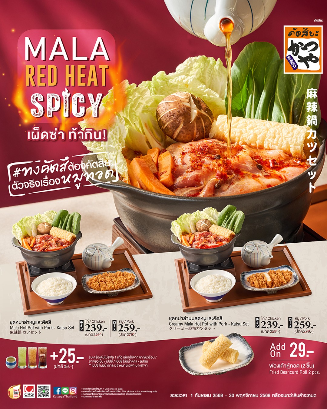คัตสึยะ (Katsuya) ทนกระแสฟีเวอร์ไม่ไหว จัดเมนูใหม่ กับ “MALA RED HEAT SPICY” สายหมาล่าต้องชอบ สายแซ่บชอบกินเผ็ดต้องโดน กับความเผ็ดชา ที่อยากท้าให้คุณกิน เลือกอร่อยได้ตามความชอบ มีให้เลือกทั้งน้ำข้นแบบหม่าล่านมสด และแบบ Original ในราคาเริ่มต้น 239 บาท