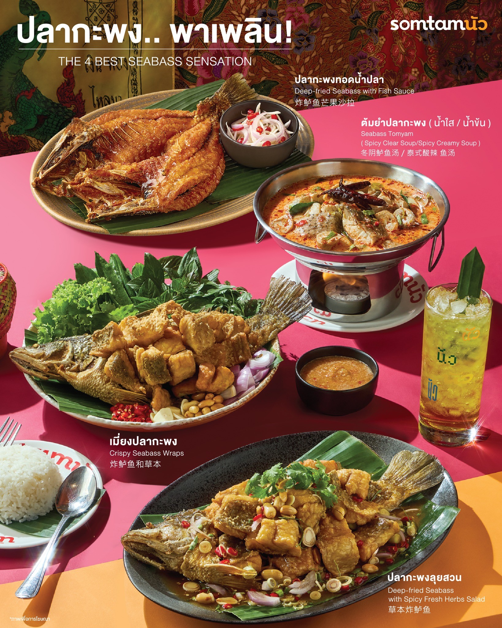 ส้มตำนัว (Somtamnua) ขอเอาใจคนรักเมนูปลา ด้วย “กะพง พาเพลิน” กับ 4 เมนูใหม่จากส้มตำนัว ที่คนรักปลาต้องมาลองเมื่อปลากะพงเนื้อแน่นๆ สดๆ มาเจอกับรสชาติจัดจ้านถึงใจสไตล์ส้มตำนัว รับรองว่าถูกปากถูกใจแน่นอน ได้แก่
