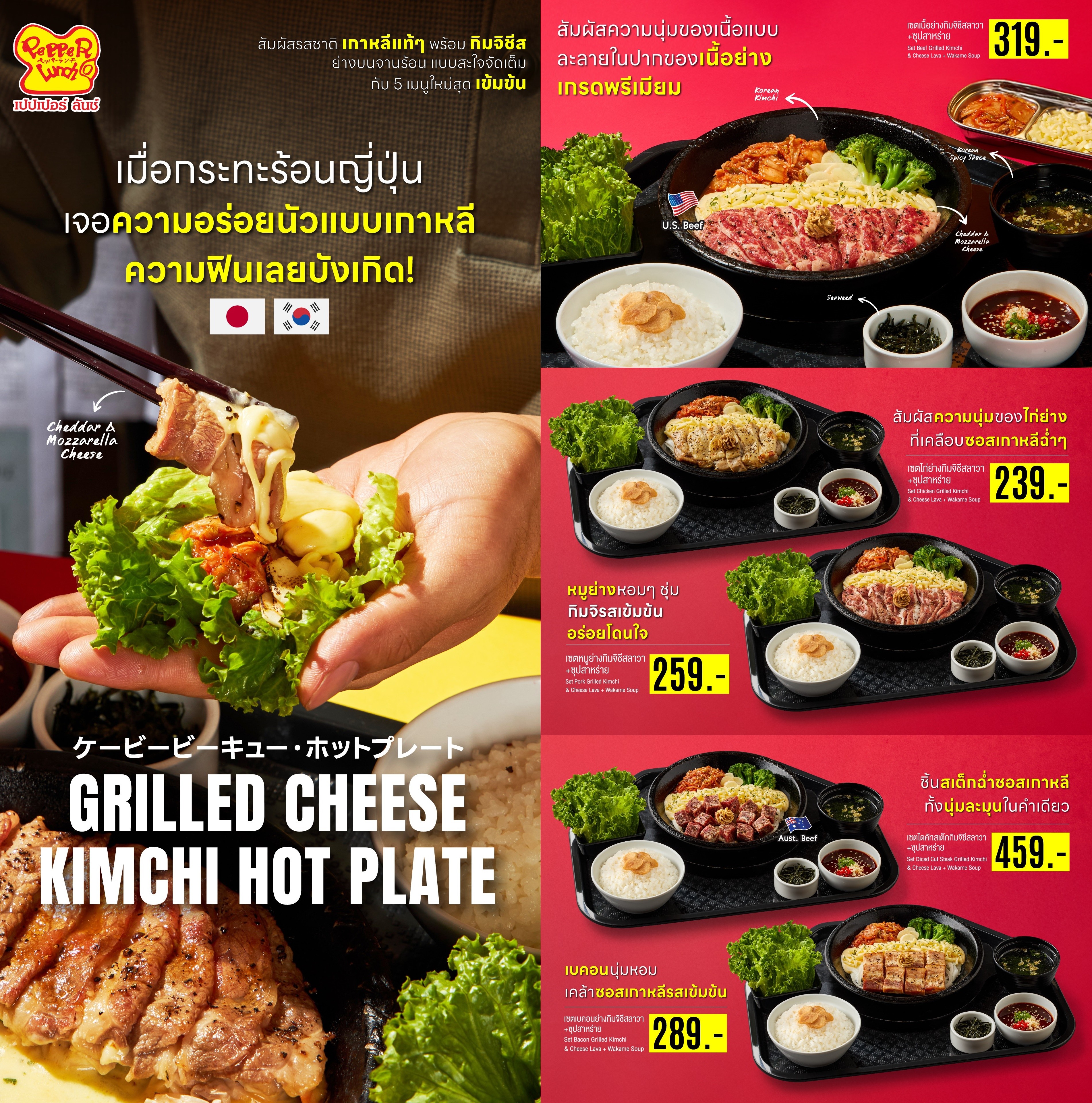 เปปเปอร์ ลันช์ (Pepper Lunch) ส่งเมนูใหม่ เมื่อกระทะร้อนแบบญี่ปุ่นมาเจอความอร่อยในแบบฉบับเกาหลี ความฟินเลยบังเกิด กับเมนู “Grilled Cheese Kimchi Hot Plate” สัมผัสความนุ่มจนละลายในปากของวัตถุดิบสุดพรีเมียม คลุกเคล้าด้วยกิมจิหอมกลมกล่อมจนได้รสละมุนแบบเกาหลีแท้ๆ เสิร์ฟพร้อมเครื่องเคียงครบเซต อร่อยละมุนทุกคำตั้งแต่คำแรกถึงคำสุดท้าย สัมผัสรสชาติแห่งความอร่อยแบบโคเรียแท้ๆ ได้เลย กับ 5 เมนูได้แก่