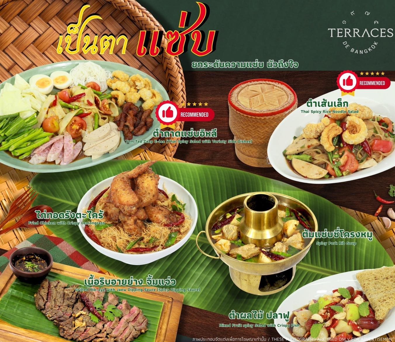 เทอเรสซ์ เดอ บางกอก (Terraces De Bangkok) ชวนมาม่วน มาจอย กัน ยกขบวบอาหารอีสาน สารพัดตำนัวๆ ตำถาดก็มี ตำหลวงพระบางก็มา ตำเส้นเล็กสุดฮิตก็ต้องไม่พลาด ตามมาด้วยเนื้อริบอายย่างฉ่ำๆ หรือจะเป็นไก่ทอดรังตะไคร้หอมเครื่องเทศสุดๆ ถ้าอยากซดอะไรร้อนๆคล่องคอ ก็ต้องต้มแซ่บซี่โครงหมูรสชาติถึงเครื่องสะใจ เชิญมาพิสูจน์ความแซ่บกันได้แล้ววันนี้ ที่ Terraces De Bangkok ทั้ง 2 สาขา ได้แก่ สาขาโรงพยาบาลศิริราช และ สาขาเซ็นทรัลสีลมทาวเวอร์