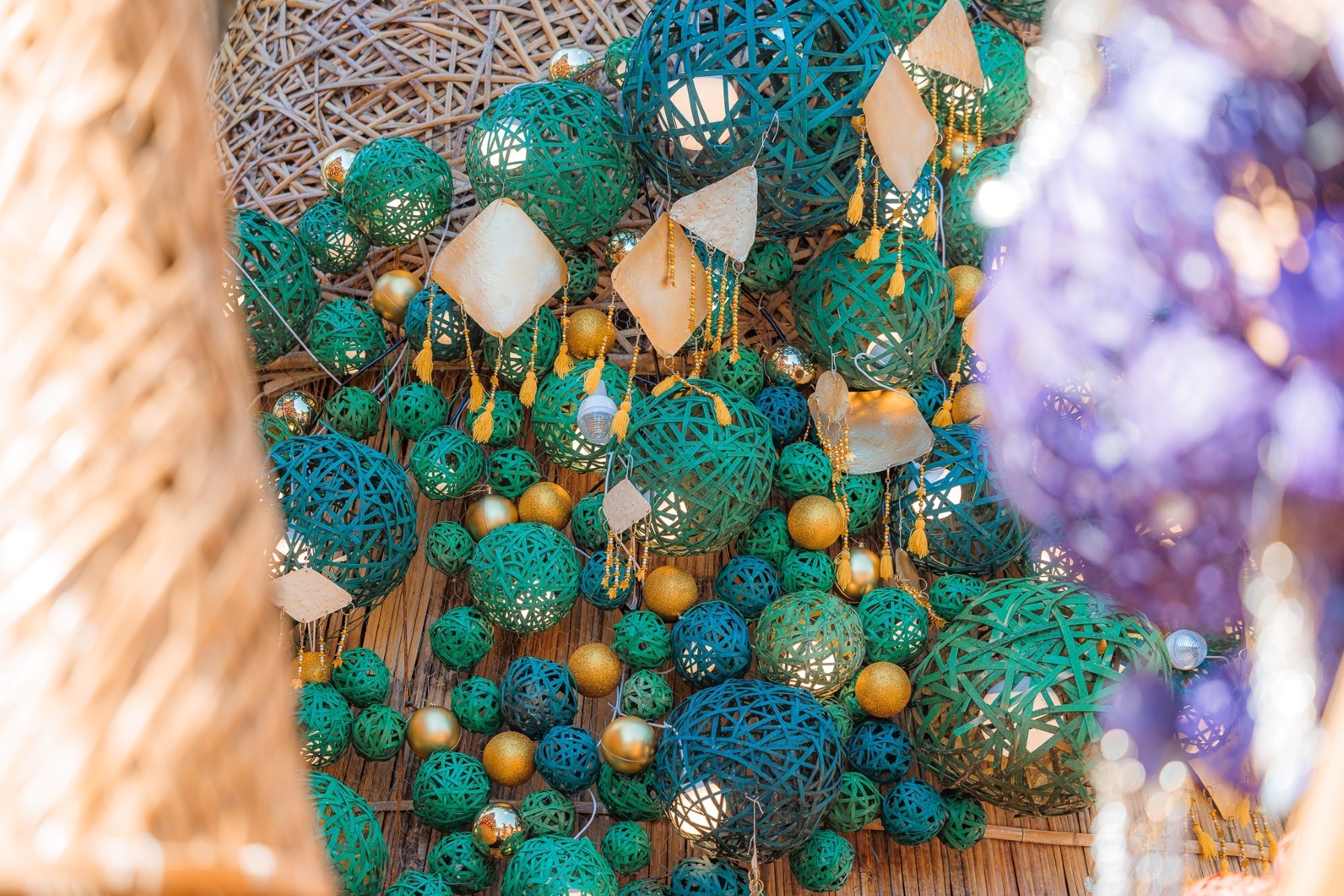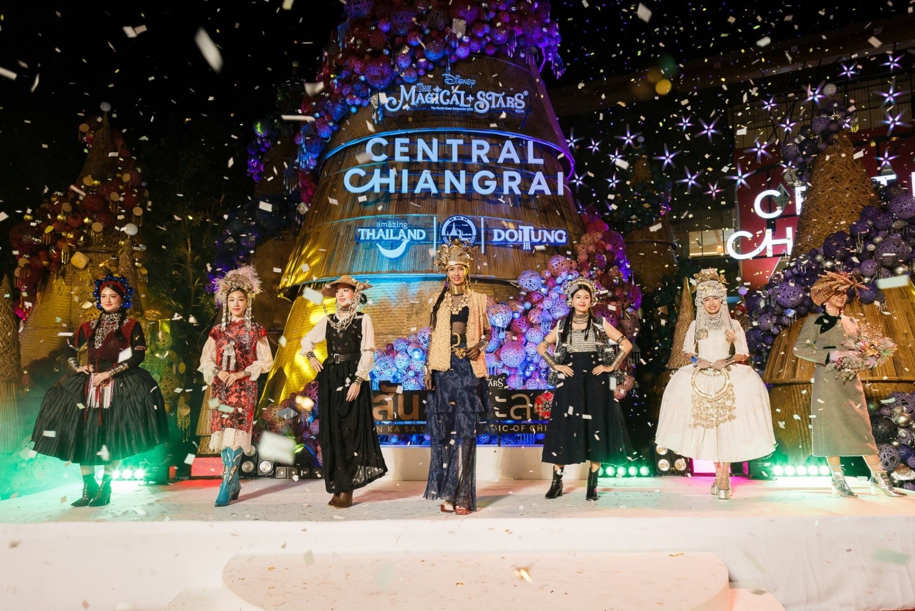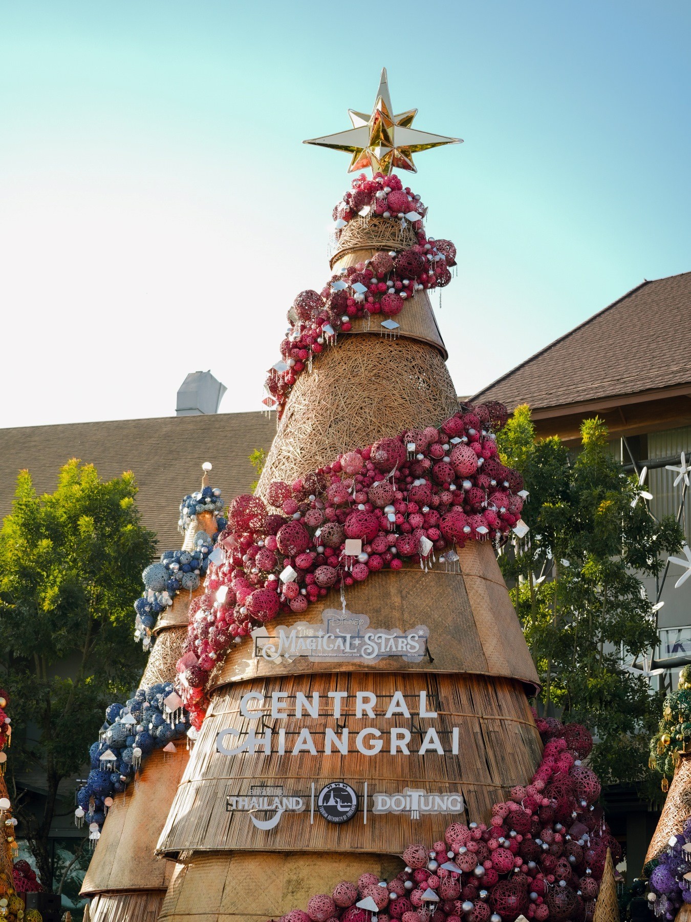 ต้นคริสต์มาสหมอกพันวา ทั้ง 7 ต้น ภายใต้คอนเซ็ปต์ ‘The Magic of Chiang Rai’ ถูกตกแต่งในรูปแบบ Thai Local Handicraft ที่รังสรรค์จากภูมิปัญญาและความภูมิใจของชาวเขาบนดอยตุง ถ่ายทอดเสน่ห์แห่งวัฒนธรรมล้านนาและอัตลักษณ์ของ 4 ชนเผ่าจากยอดดอยสูง ได้แก่ ชาวอาข่า ชาวลาหู่ ชาวลัวะ และชาวไทใหญ่ที่สืบทอดมาอย่างยาวนาน ผสมผสานเป็นงานคราฟต์ไทยที่ประณีต โดยใช้วัสดุไม้ไผ่สานย้อมสีธรรมชาติ ตกแต่งด้วยเครื่องประดับ ลูกปัด และงานหัตถกรรมท้องถิ่น ผสานกับแสงไฟ LED ที่ระยิบระยับหลากสีสัน สื่อถึงเรื่องราวของวิถีชีวิต ความผูกพันกับธรรมชาติ และคุณค่าทางวัฒนธรรม โดยแต่ละลวดลายมีความหมายเฉพาะ เช่น